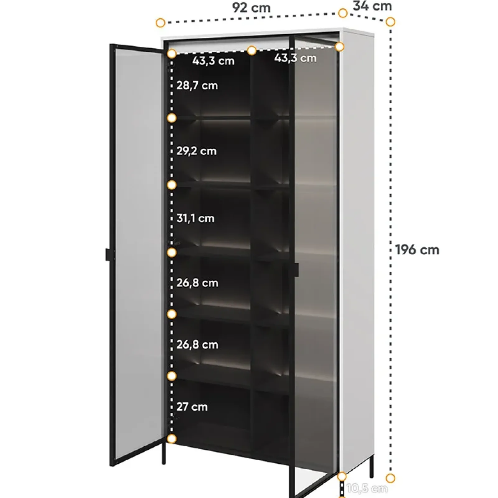 Stai cercando un modo moderno ed elegante per esporre i tuoi oggetti preferiti? Una vetrina in vetro potrebbe essere la soluzione perfetta per te! Questo elegante mobile non solo ti consentirà di presentare in modo efficace souvenir e decorazioni, ma ravviverà anche i tuoi interni. Una vetrina in vetro è una scelta eccellente per le persone che apprezzano il minimalismo moderno e la funzionalità. I colori alla moda dei mobili lo rendono intramontabile. La vetrina è stato progettato in cinque versioni di colore e dispone anche di un’illuminazione suggestiva sotto forma di una striscia LED sotto il piano di lavoro superiore. Opzionalmente è possibile dotarla anche di illuminazione posizionata dietro i ripiani interni. Una delle caratteristiche più importanti di una vetrina in vetro bianco è la sua versatilità. L’anta in vetro protegge il contenuto della vetrina da polvere e danni, e allo stesso tempo permette di ammirare liberamente gli elementi presentati. Grazie a questo, i tuoi oggetti preferiti saranno sempre ben esposti e facilmente accessibili. La vetrina è realizzata con materiali di alta qualità, che ne garantiscono solidità e durata. Il suo design minimalista si sposa bene con vari stili di interior design, dal moderno allo scandinavo o al classico.