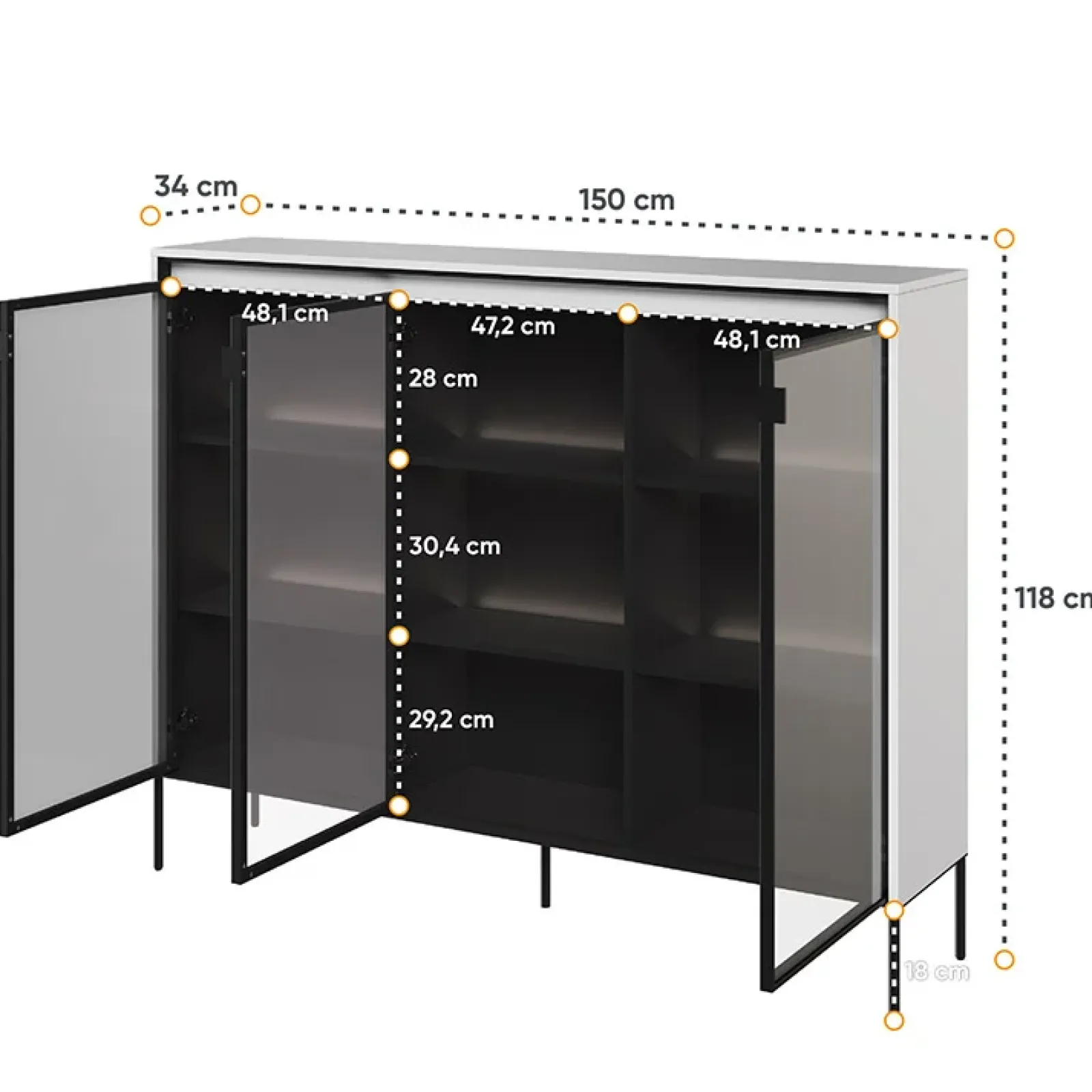 Vetrina bassa 3 ante led 150x118cm bianco opaco nero Camelia