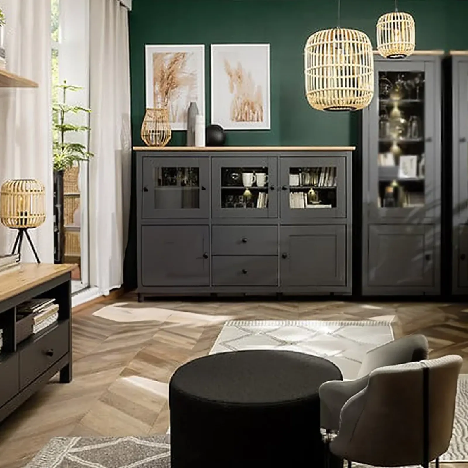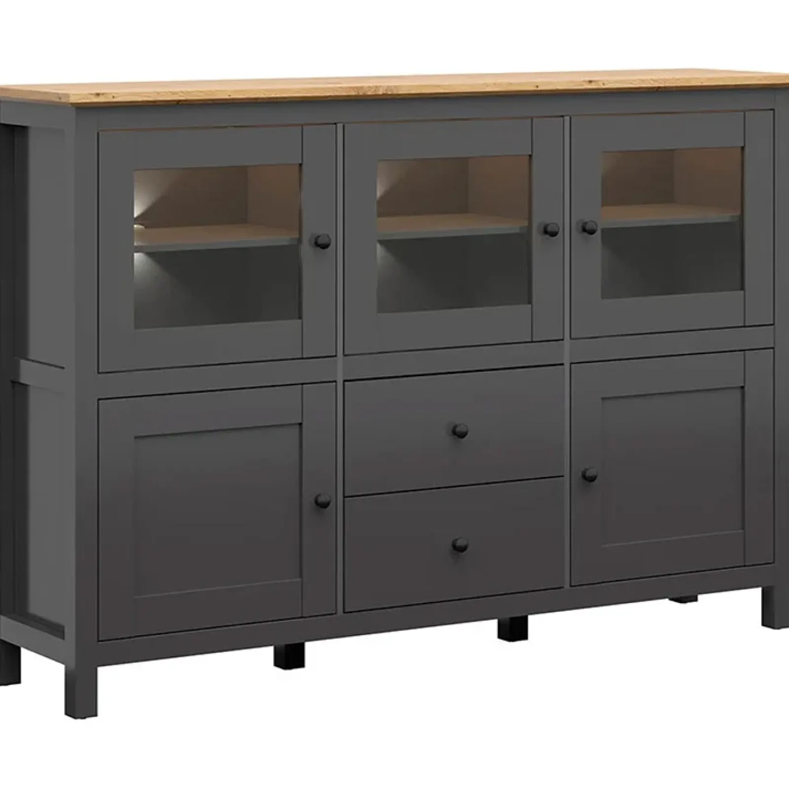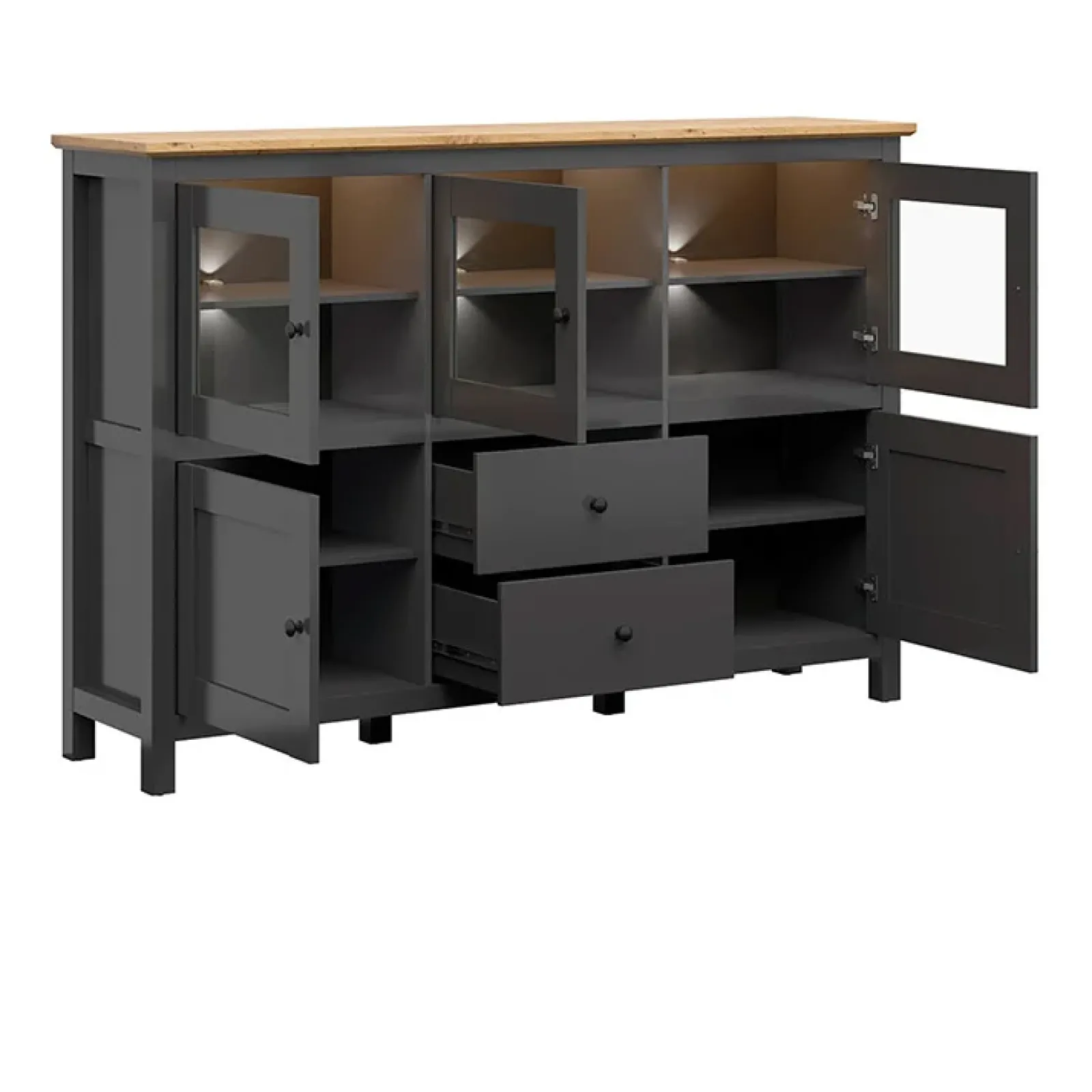 Vetrinetta 186x126cm 2 cassetti 5 ante nero grafite rovere chiaro Holga