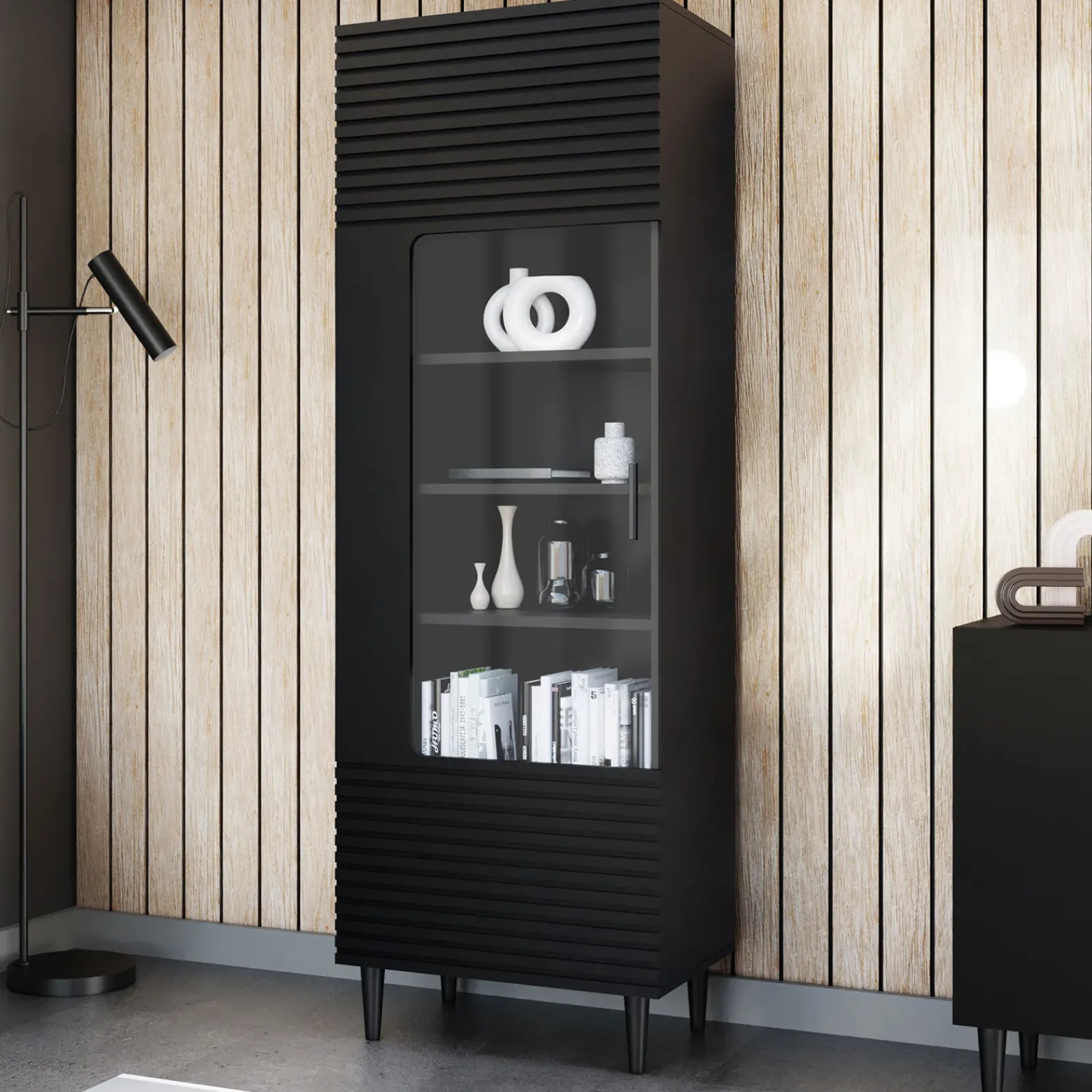 La vetrinetta Flippo è un mobile dal design moderno ed elegante, perfetta per chi desidera un arredo che combini funzionalità e stile. Il frontale cannettato nero dona un tocco di raffinatezza e carattere, creando un contrasto elegante con l’anta vetrata che permette di esporre oggetti decorativi, libri o collezioni con classe. La struttura nera del mobile conferisce un aspetto deciso e contemporaneo capace di adattarsi a qualsiasi tipo di ambiente moderno. Con 1 anta vetrata e 5 ripiani interni, offre ampio spazio per riporre oggetti, mantenendo tutto ben organizzato e accessibile. La vetrinetta Flippo è ideale per chi cerca un pezzo di arredo elegante e funzionale, perfetto per arredare soggiorni, salotti o zone living in stile moderno, con un accento distintivo dato dai dettagli cannettati e dalla combinazione di materiali.