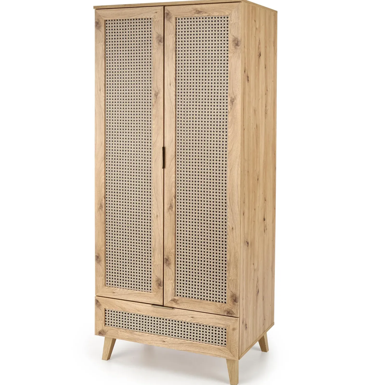 La struttura è dotata di 2 ante con maniglie, al cui interno lo spazio è suddiviso in due sezioni verticali: da un lato troviamo 4 ripiani interni perfetti per riporre libri, oggetti decorativi o articoli di uso quotidiano; dall’altro lato è presente uno spazio libero ideale per capi appesi o contenitori alti. Completa la composizione un cassetto capiente alla base, pensato per tenere tutto in ordine e a portata di mano.