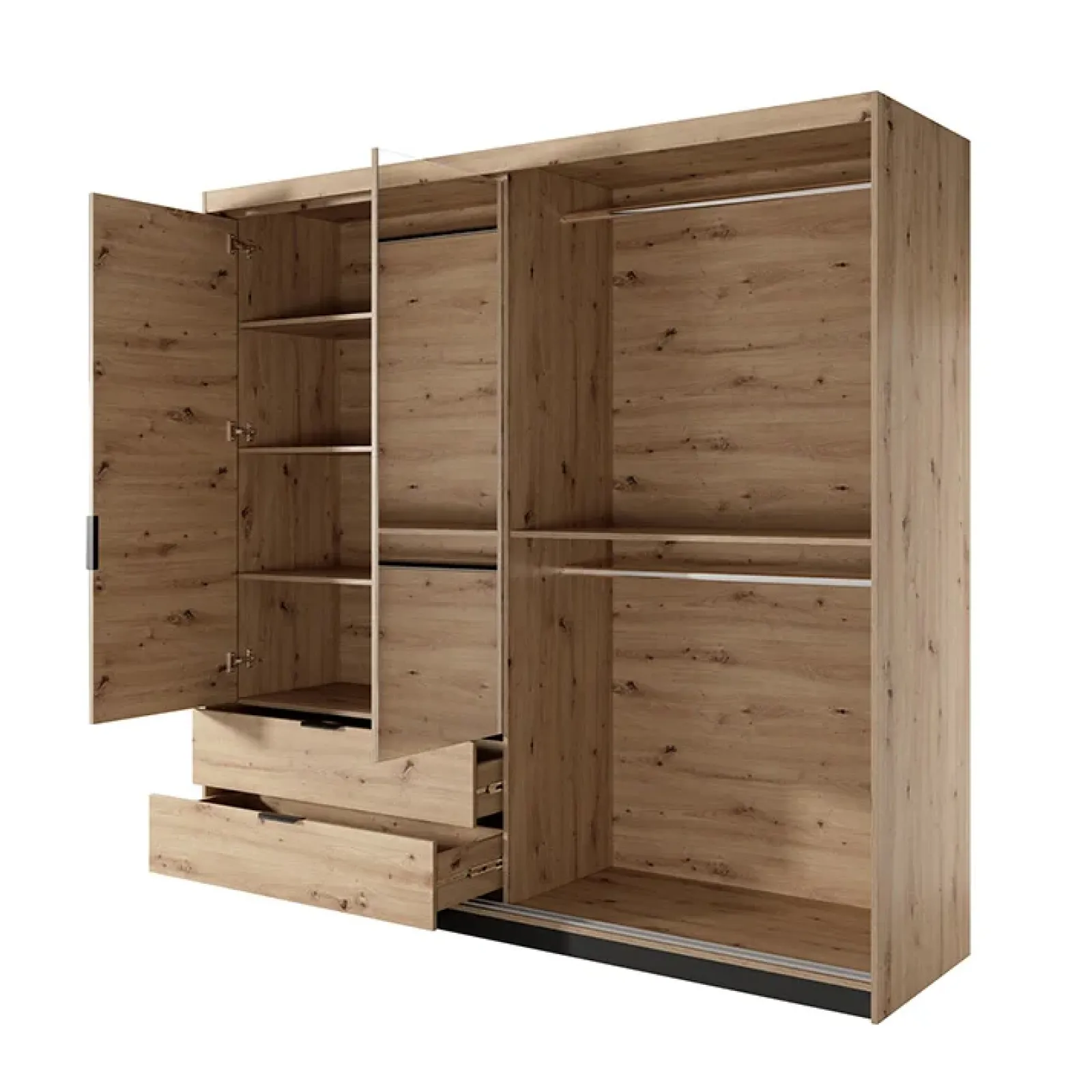 É composto da 4 ante a battente, di cui 2 con specchio, e due cassetti. All’interno possiede due lunghi tubi appendiabiti, nella parte destra, mentre nella parte sinistra 3 ripiani perfetti per i capi stirati che devono essere trattati con più delicatezza. É possibile inserire una striscia di luce a led (esclusa dall’offerta) nella parte del cornicione superiore. Rubik è da sempre considerato la migliore soluzione salvaspazio per la zona notte! Completa la camera con gli altri elementi della stessa collezione.
