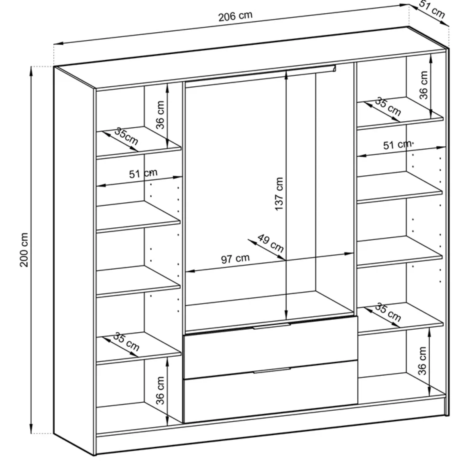 I due scompartimenti più esterni possiedono 5 ampi vani ciascuno, utili per riporre la biancheria o abiti piegati, per un peso massimo di 5 kg. Lo scompartimento centrale, invece, è dotato di due capienti cassetti alla base e di un vano richiudibile con due ante in antracite, adibito per appendere lunghi vestiti, grazie alla presenza di un binario per appendini.
