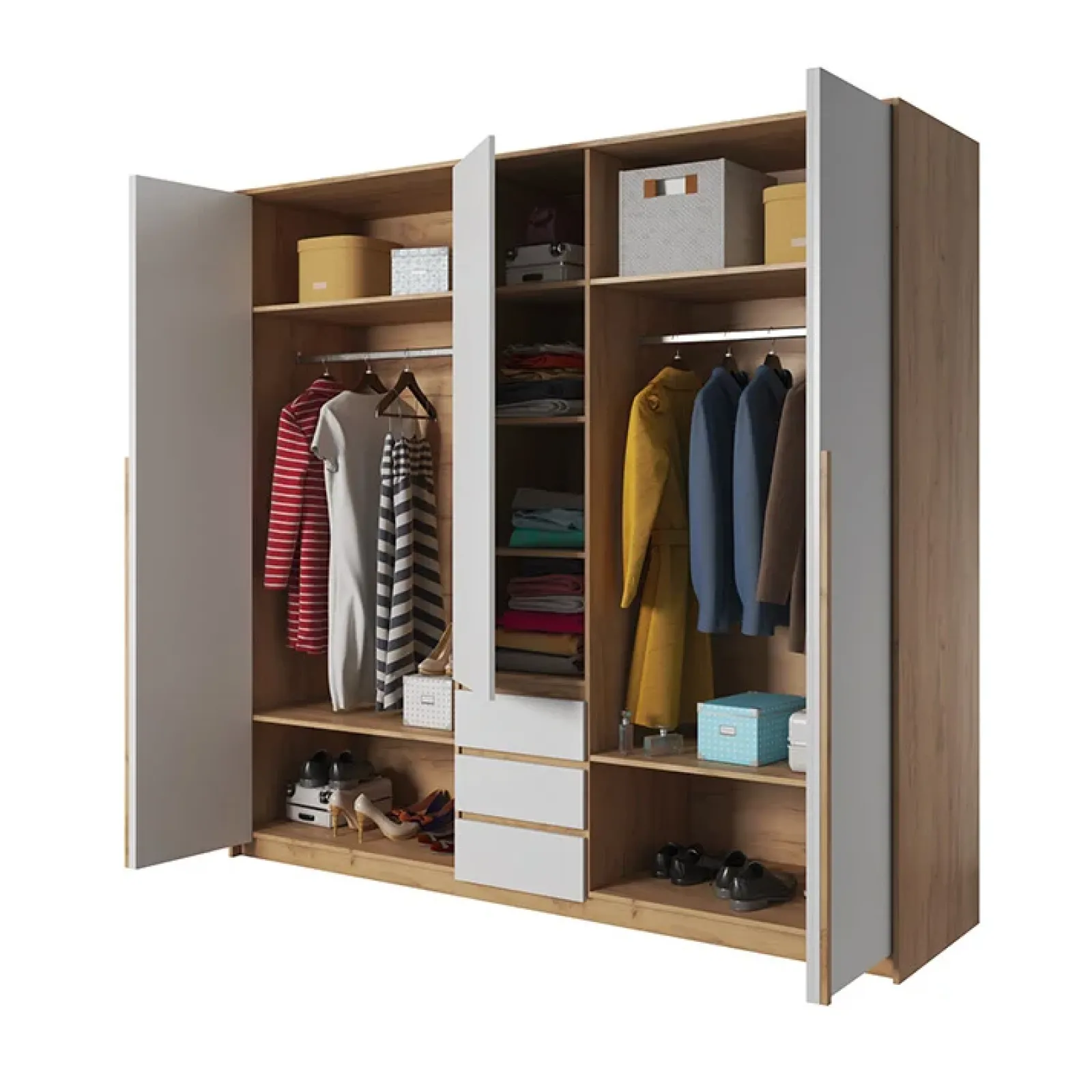 Armadio 225x214cm 5 ante 3 cassetti bianco rovere Sweet: salvaspazio e di facile apertura per te che ami l’ordine!