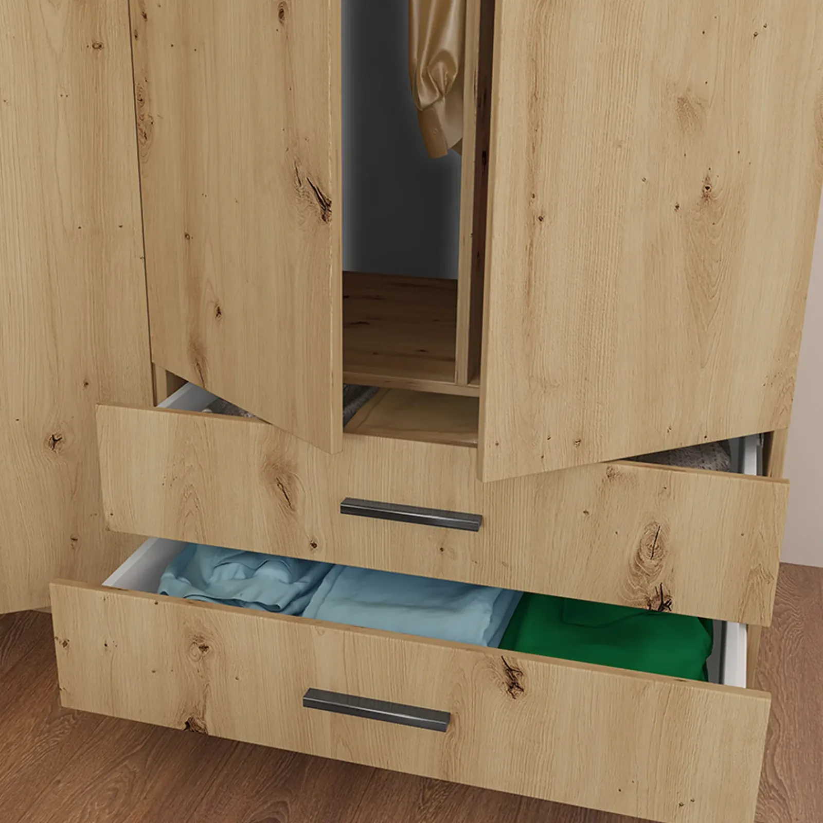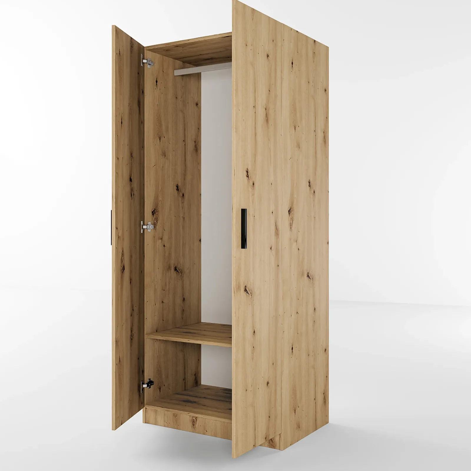 Proposto in questa stupenda finitura Ilario presenta 2 ante battenti che si aprono su un unico capiente vano dotato di asta appendiabiti. Nella parte inferiore inoltre presenta un ripiano utile per riporre indumenti piegati, borse o accessori.