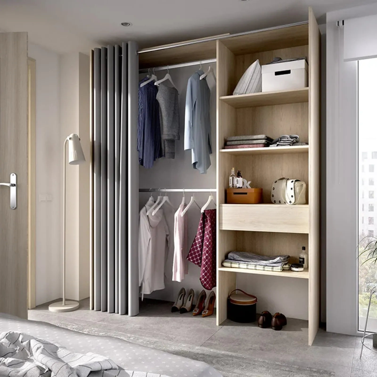 Cabina armadio 160x205cm moderno allungabile aperto con tenda rovere noce Gover, caratterizzato da misurazione prolungabile potrà soddisfare ogni tipo di esigenza!