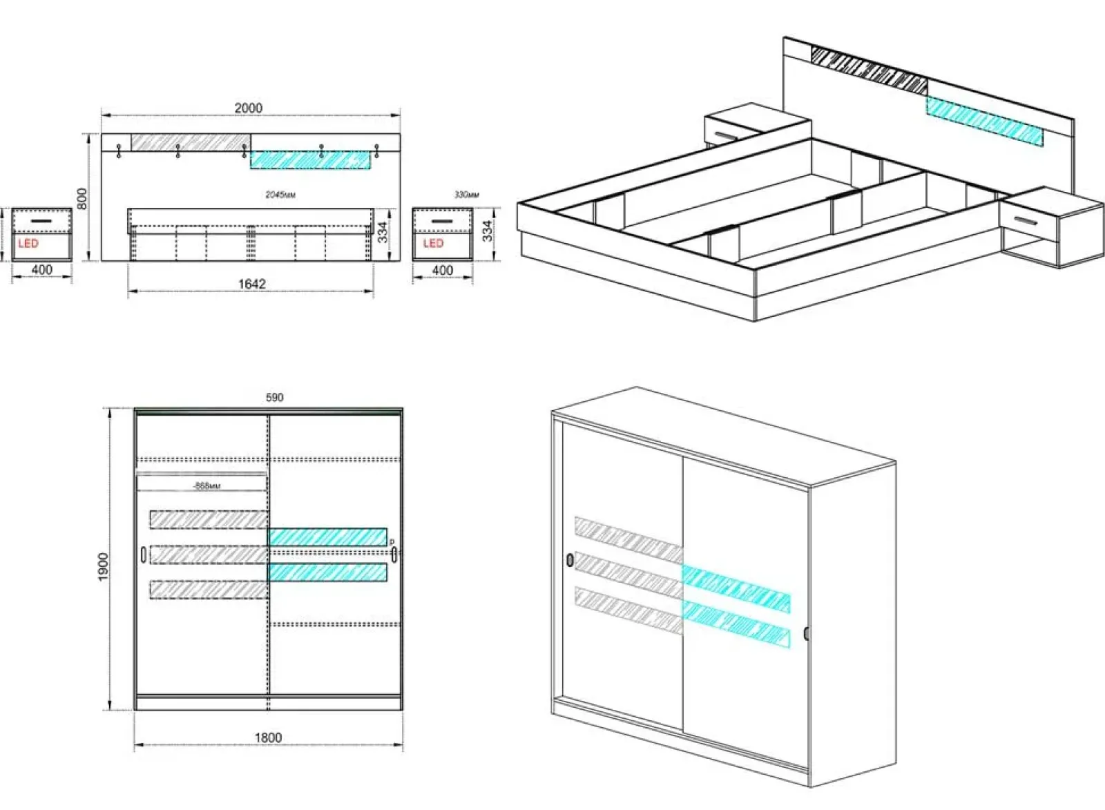 - Comodini dotati di illuminazione RGB (numerose colorazioni che si selezionano tramite telecomando)