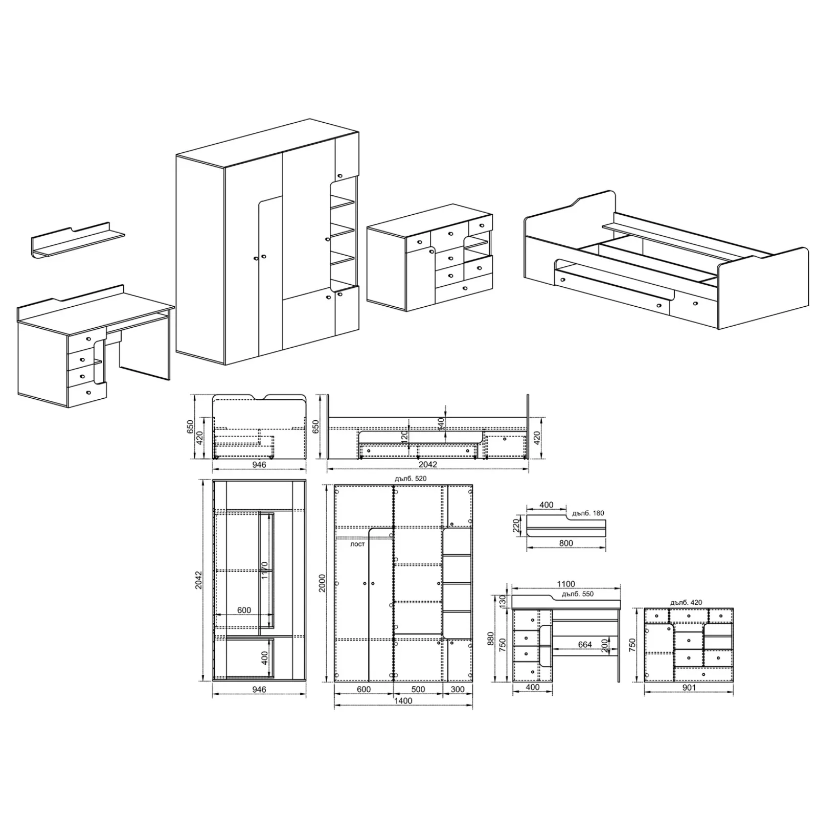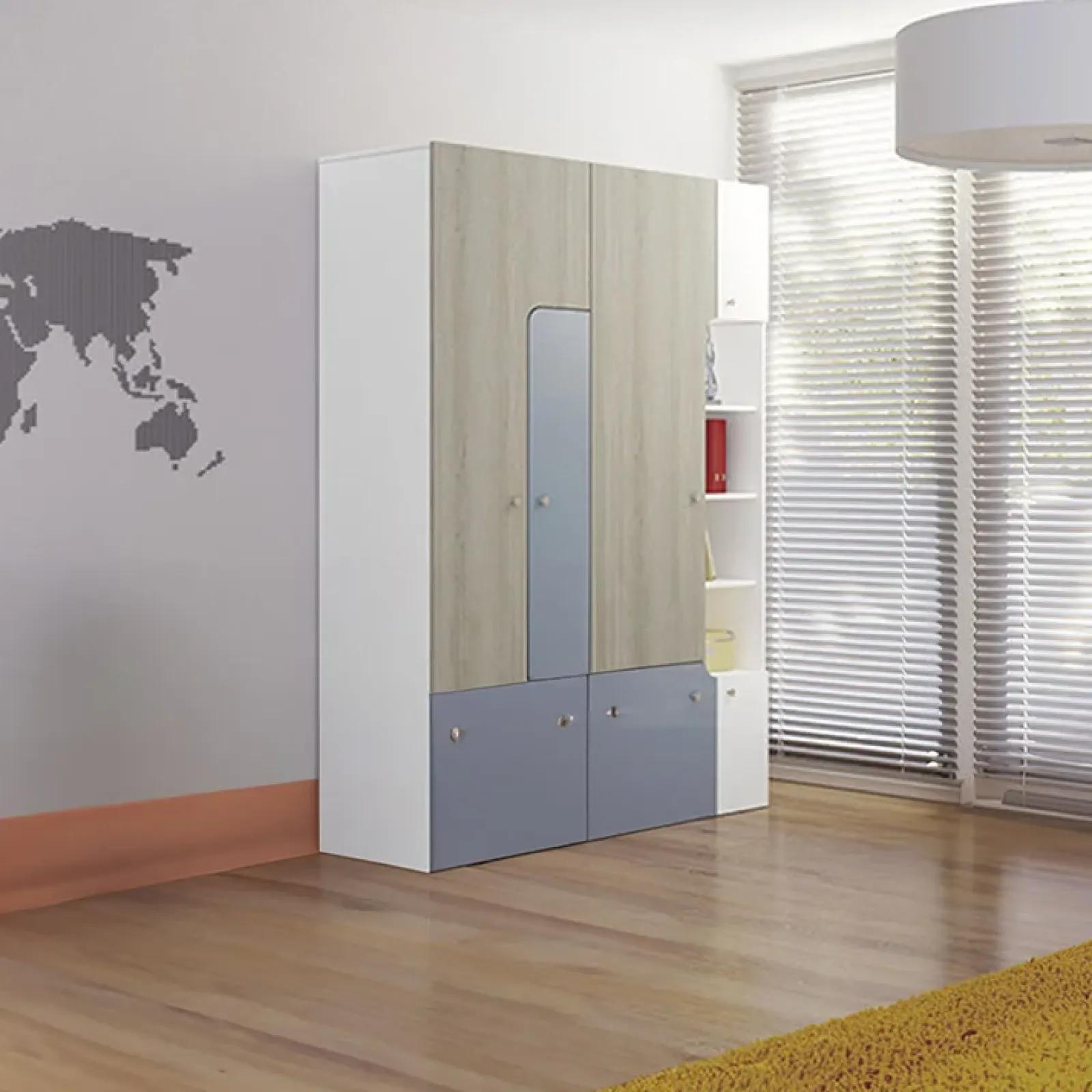 Realizzato in materiale melaminico e rifinito in bianco opaco/azzurro, questo set unisce funzionalità e design, creando un ambiente accogliente e luminoso per i bambini.