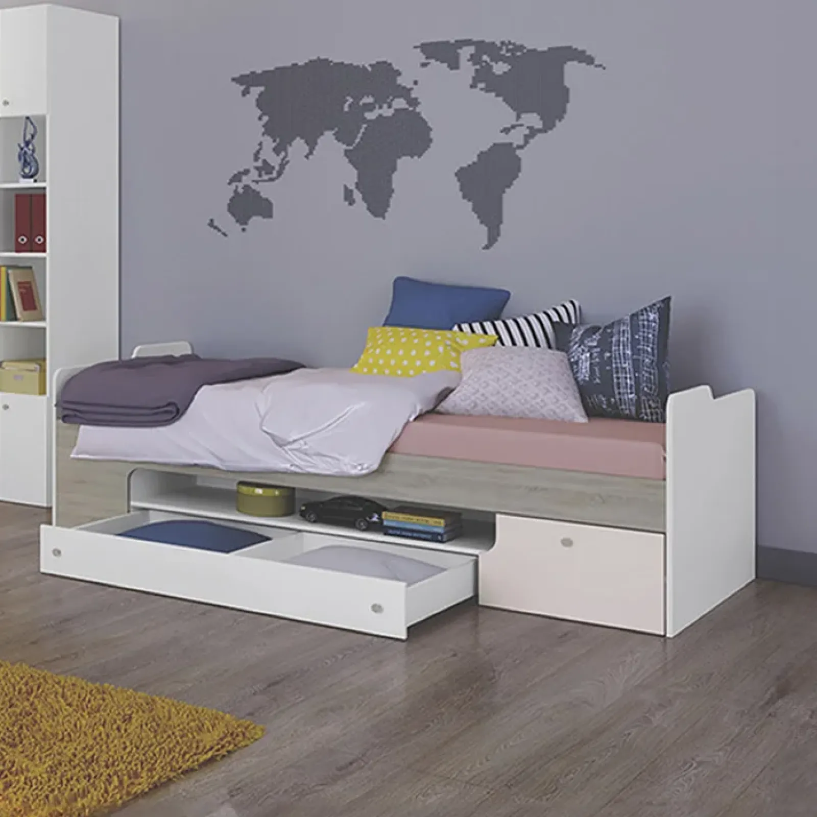 Nella cameretta per bambini, troverai un ambiente pensato per comfort e praticità. Il letto è di tipo singolo e è progettato per una rete e un materasso di 90×200 cm (non inclusi). Questo letto presenta un pratico contenitore con cassettoni estraibili, ideale per organizzare gli spazi.