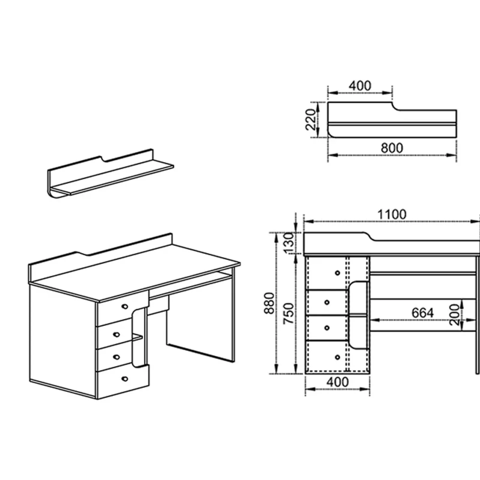 - Dimensioni scrivania: L.110 x H.88 x P.55 cm