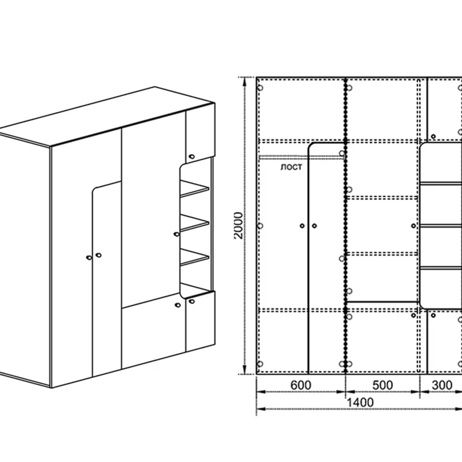 - Dimensioni armadio: L.140 x H.200 x P.52 cm