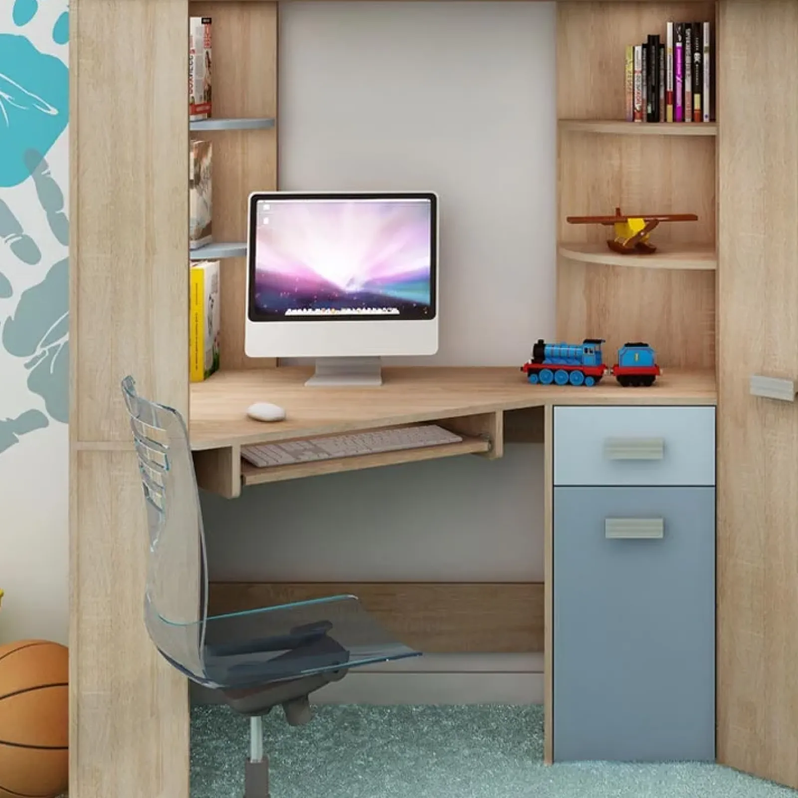 La Cameretta Dollie Gihome® destra rovere blu: la soluzione ideale per la cameretta dei tuoi ragazzi. Dotata di armadio, cassetti e mensole rende funzionale ogni spazio per il riodino di indumenti e giocattoli.