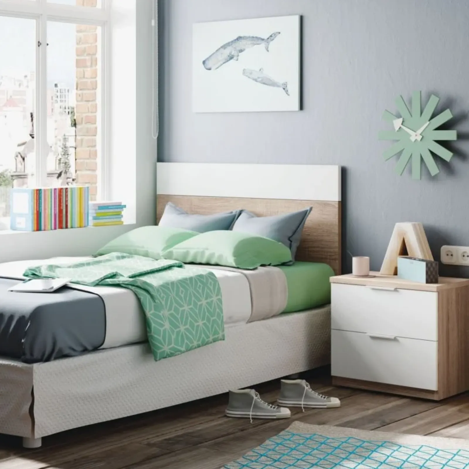 E’ proposta nella colorazione rovere naturale e bianco opaco ed è composta da una testiera con attacco a muro, un comodino a due cassetti e un armadio a due ante a battenti e due cassetti.