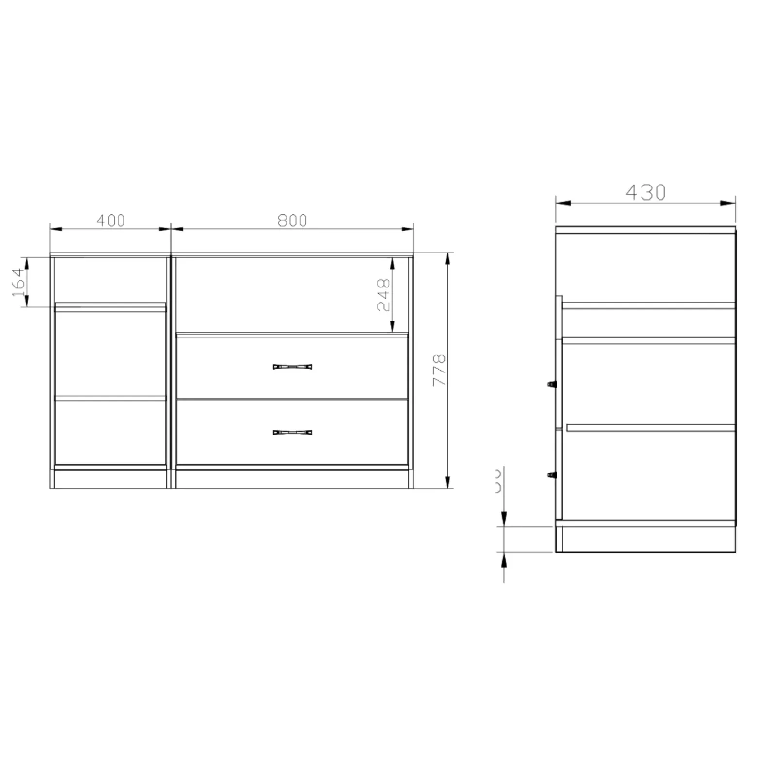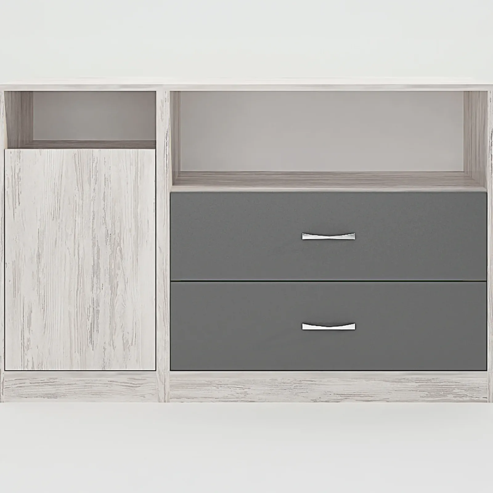 - Comò dotato di 2 cassetti, 1 anta e 2 vani a giorno
