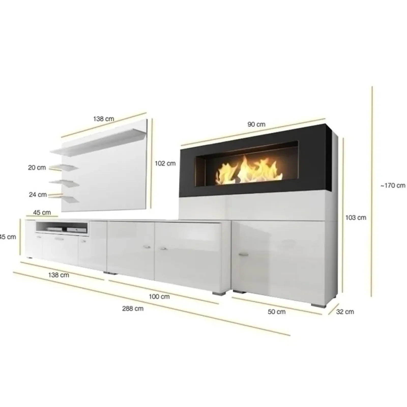 Parete attrezzata 288x170cm bianca camino bioetanolo Olympo