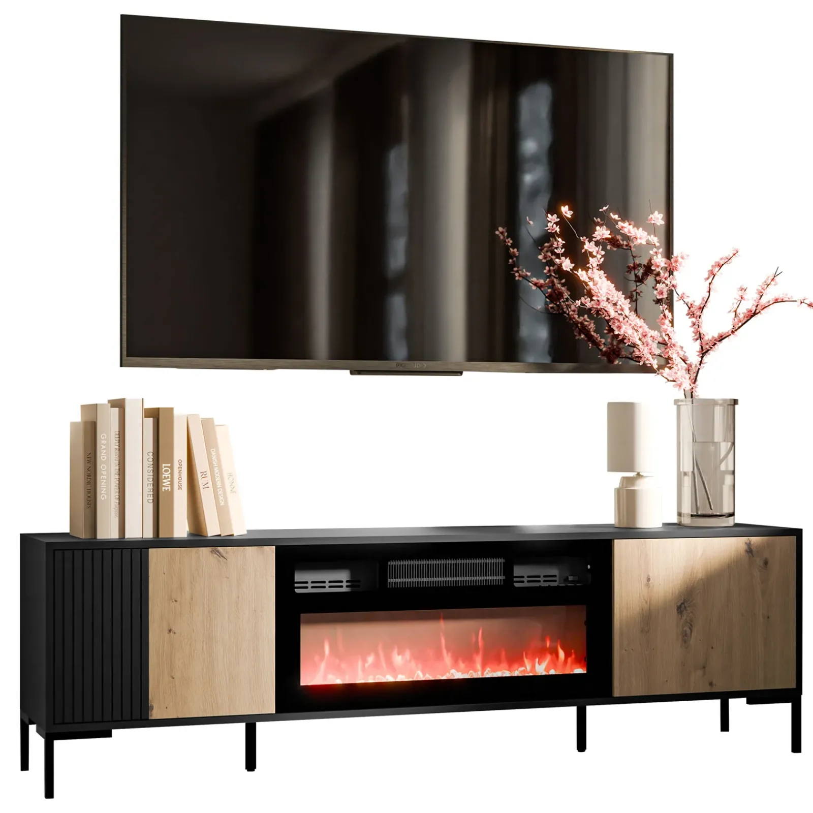 Garnero Arredamenti Camino Elettrico|Mobile Tv Basso-Mobile TV con camino 180x54h cm rovere nero Duble