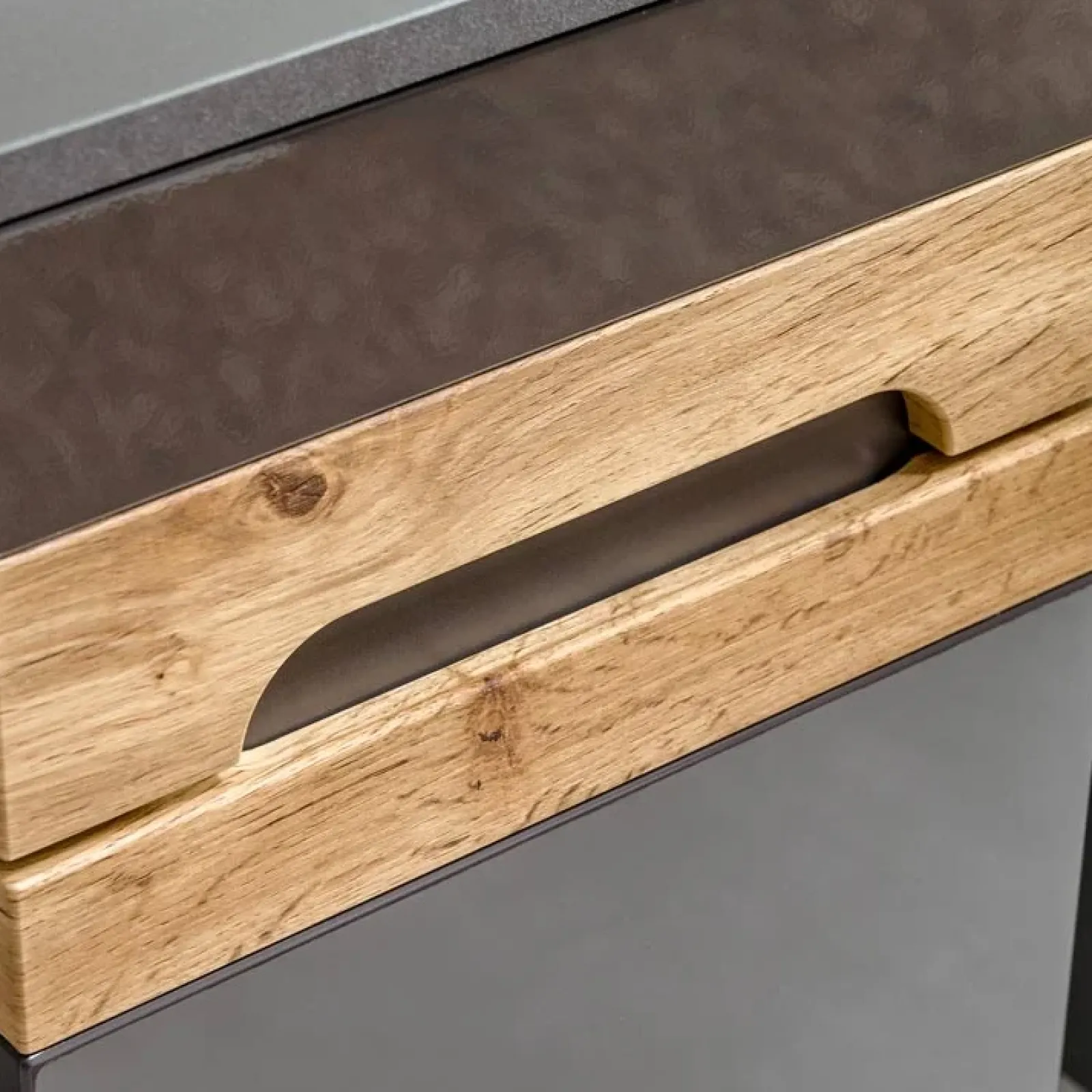 E’ dotata di un’anta e un cassetto con maniglie a gola con interno effetto legno rovere chiaro.