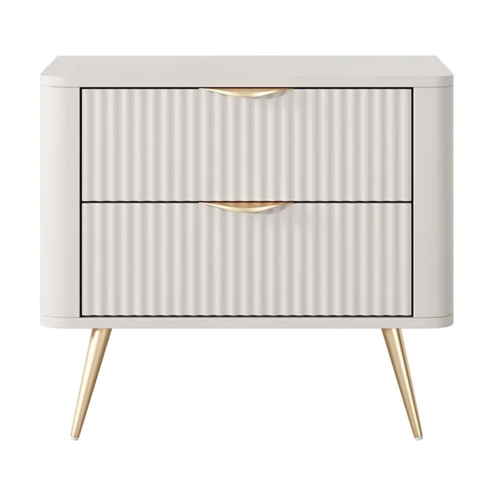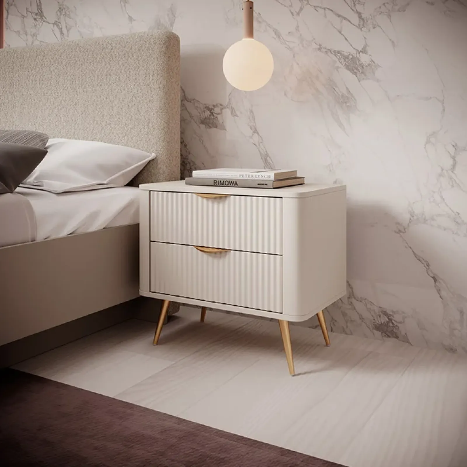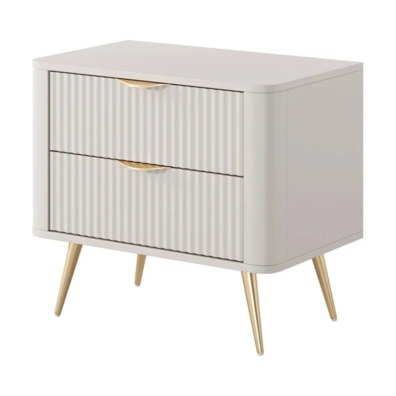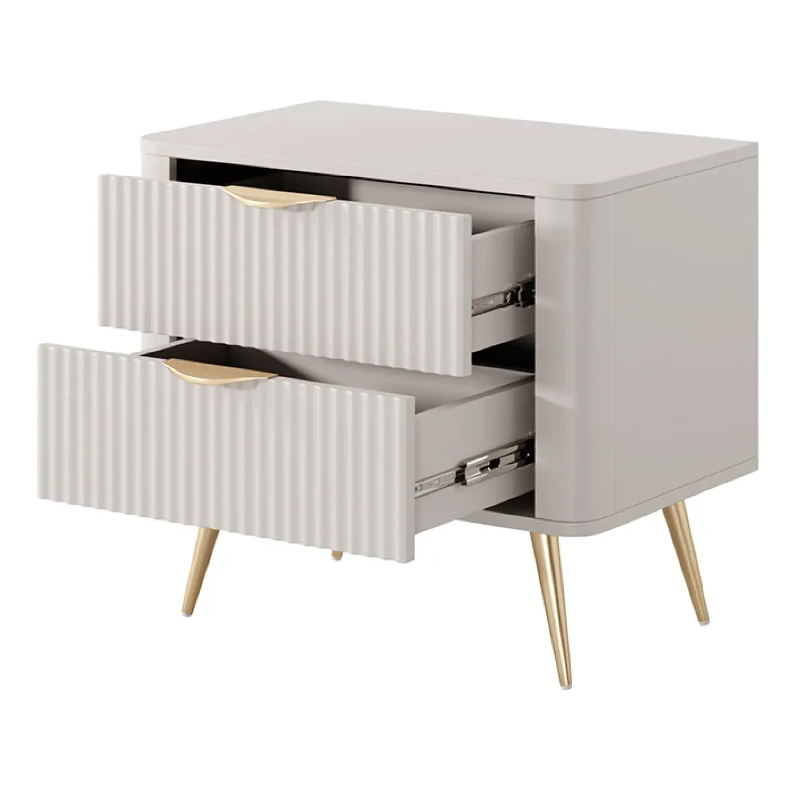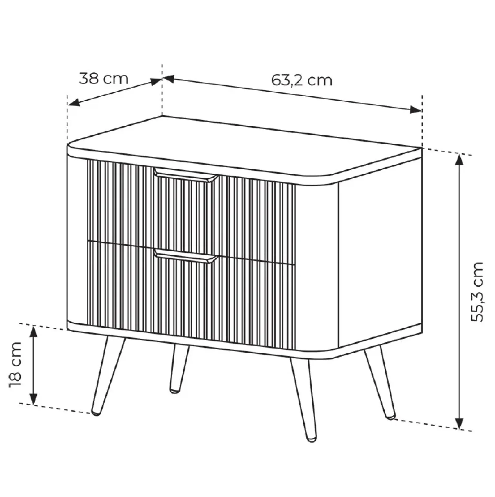 Vuoi trasformare la tua camera da letto in un’oasi di ordine e stile? Grazie al comodino 2 cassetti Ramis potrai finalmente avere tutto a portata di mano! La sua finitura beige con frontali cannettati dona al comodino uno stile elegante mentre il suo formato compatto lo rende ideale per qualsiasi tipo di camera da letto, anche per stanze più piccole! È dotato di 2 cassetti, facilmente apribili tramite le maniglie in metallo dorato, che offrono una soluzione pratica per riporre oggetti personali come libri, occhiali, caricatori o altri accessori, mantenedo il piano del comodino libero da ingombri. Il piano superiore è ideale invece per accogliere una lampada o una sveglia. Il comodino poggia su piedini in metallo dorato alti 18 cm per facilitare l’accesso agli oggetti posizionati all’interno del comodino, rendendoli più facilmente raggiungibili. Il comodino Ramis combina eleganza, praticità e resistenza ideale se desideri uno spazio ben organizzato senza compromettere il design. Disponibile anche in altre finiture!