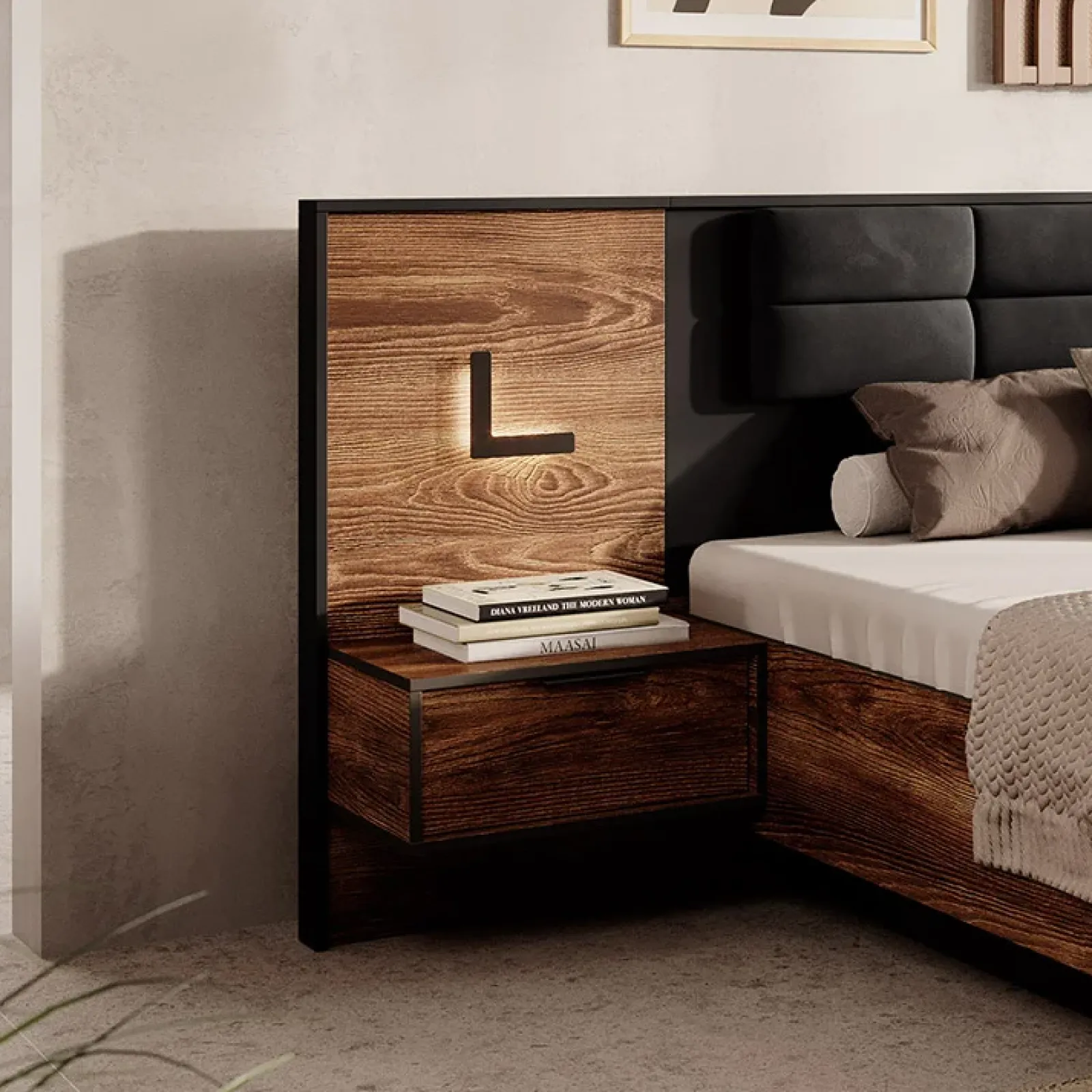 Formato da un cassetto con sistema di chiusura soft closing e dall’apertura mediante maniglia, si presta ad essere una soluzione funzionale se allocata accanto al letto. Infatti il cassetto e il ripiano sono perfetti per appoggiare occhiali, telefono e tutto ciò che serve per la mattina.