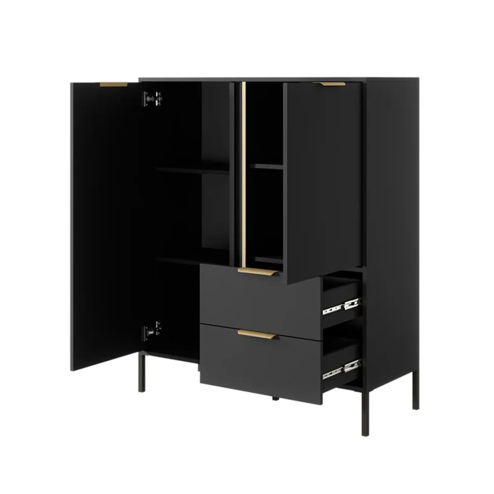 Dotato di 2 ante con ripiani interni e due cassetti rende la tua credenza più spaziosa e moderna. L’apertura è con comode maniglie esterne. Capienza e funzionalità non possono mancare in un elemento d’arredo così unico! Sorprende per la sua finitura in antracite che risalta grazie ai bordi in effetto oro. La soluzione è davvero innovativa, originale ed elegante. La struttura rialzata, grazie a comodi piedini in metallo nero, mette in evidenza le forme armoniose di questo complemento.