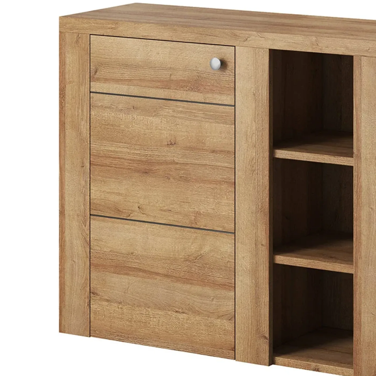 La credenza Paloma nella finitura rovere è apprezzata per l’estrema adattabilità, così da potersi integrare perfettamente in molteplici idee di stile e design.