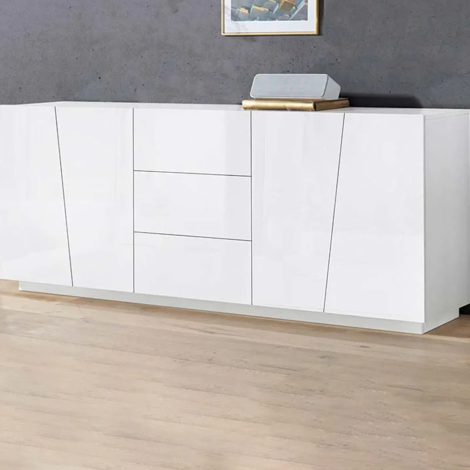 Credenza Candia Gihome ® 4 ante 3 cassetti bianco lucido, un complemento d’arredo minimal e funzionale, che non passerà inosservato nel tuo soggiorno!