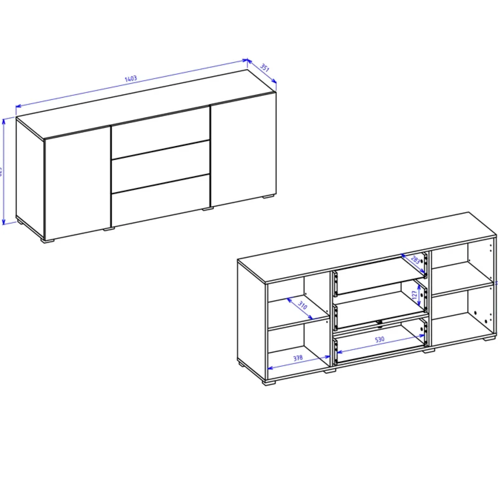 La credenza moderna Fusion è dotata di: bordi ricoperti da una fascia perimetrale su tutti i lati e due ante battenti laterali, con all’interno due vani interni ciascuna.