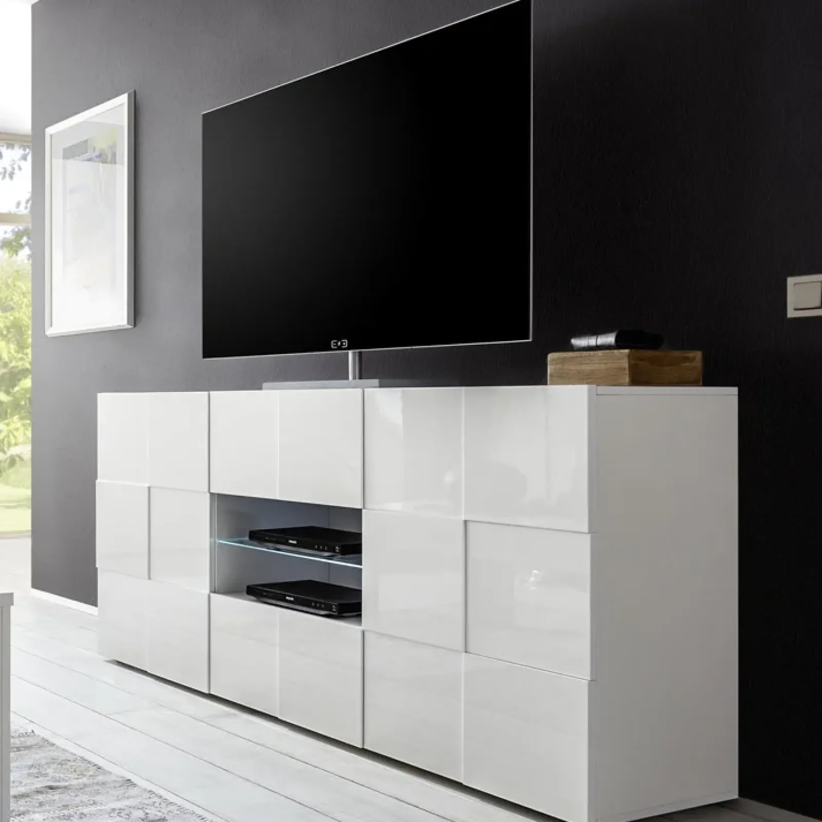 Mobile elegante e molto stabile, realizzato in finitura bianco lucido per arredare la casa con uno stile moderno e ricercato. Può assolvere sia alla funzione di base TV sia di madia ed è dotato di un vano a giorno con mensola in vetro, due cassetti e due ante con ripiani interni. È impreziosito dalla decorazione a Obsession delle ante che lo rende un complemento unico e originale. Rappresenta sicuramente una scelta di classe per abbellire la vostra casa.