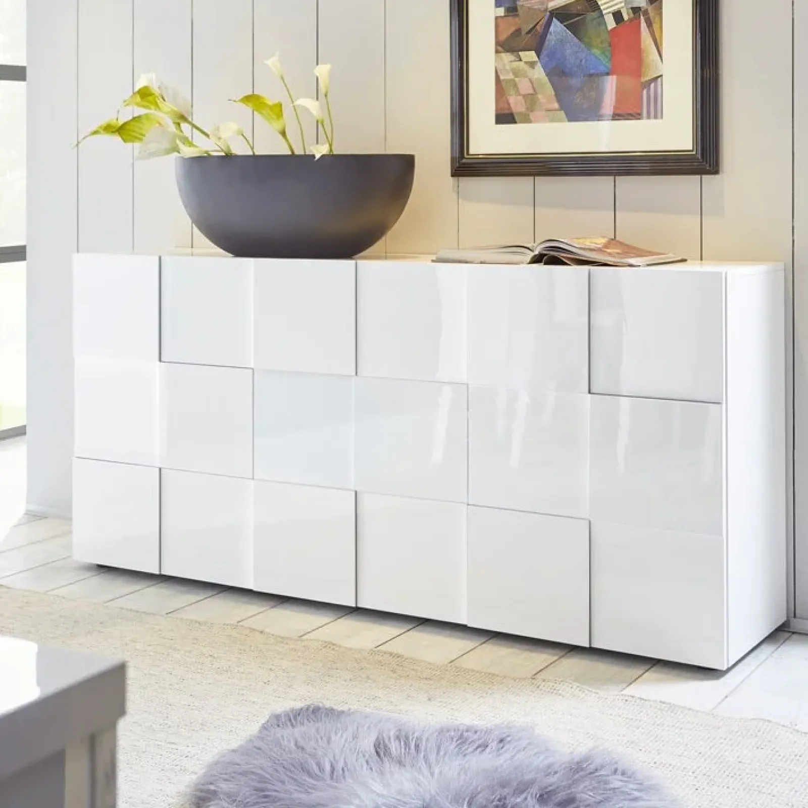 Una soluzione che racchiude l’intramontabile eleganza del bianco lucido e la pratica funzionalità del mobile da riordino. Essenziali linee geometriche delineano superfici ampie e robuste, creando così un perfetto gioco di equilibri per un complemento non solo utile, ma soprattutto esteticamente sorprendente. Dotato di 3 ante con originale decorazione a dama per offrire tanto spazio interno unitamente al fascino di una madia elegante e ricercata.