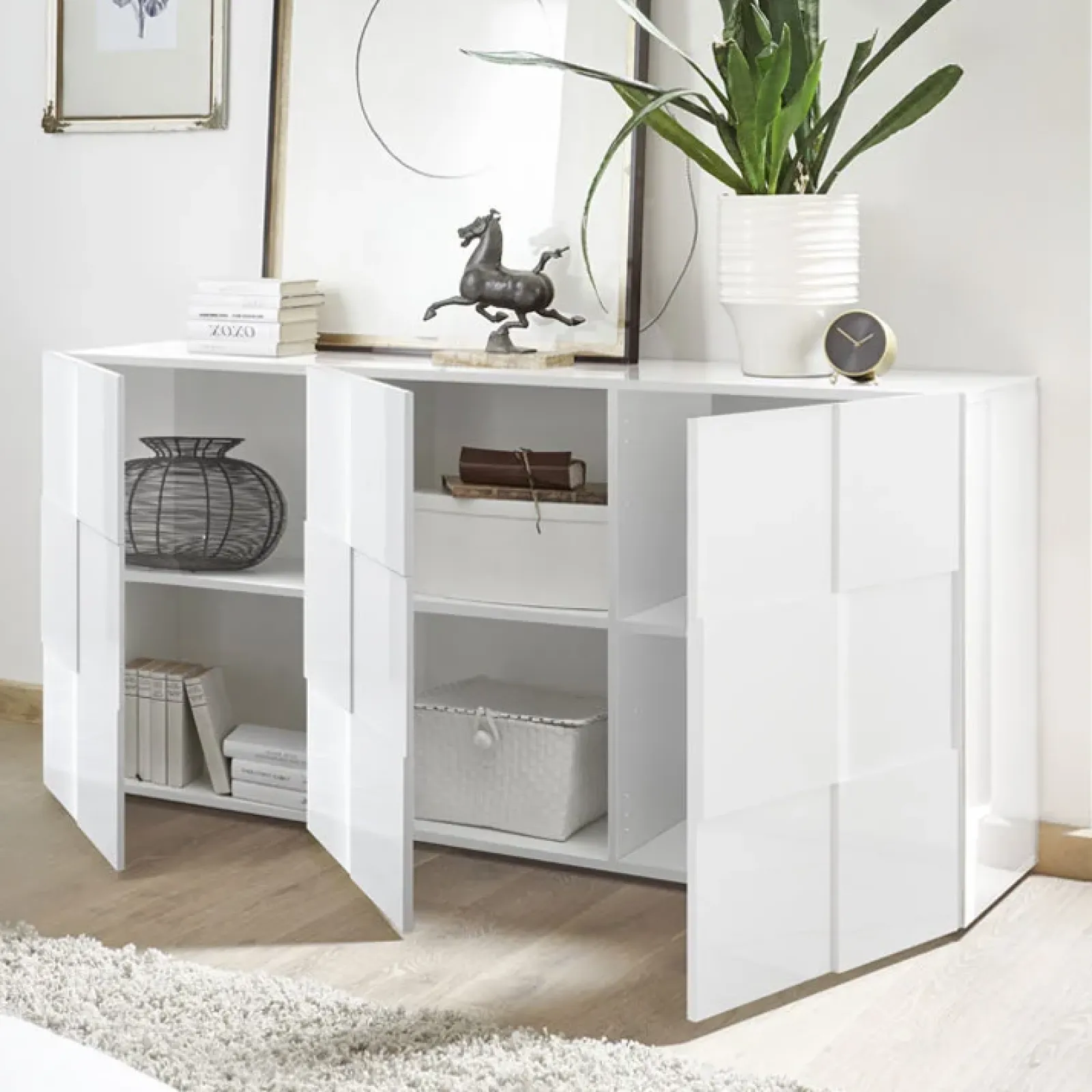 Con la madia moderna Obsession bianco lucido, trasforma il tuo spazio living in uno scenario di stile e funzionalità. Combinando design accattivante e praticità, questa madia è perfetta per chi cerca una soluzione di arredamento elegante e versatile.