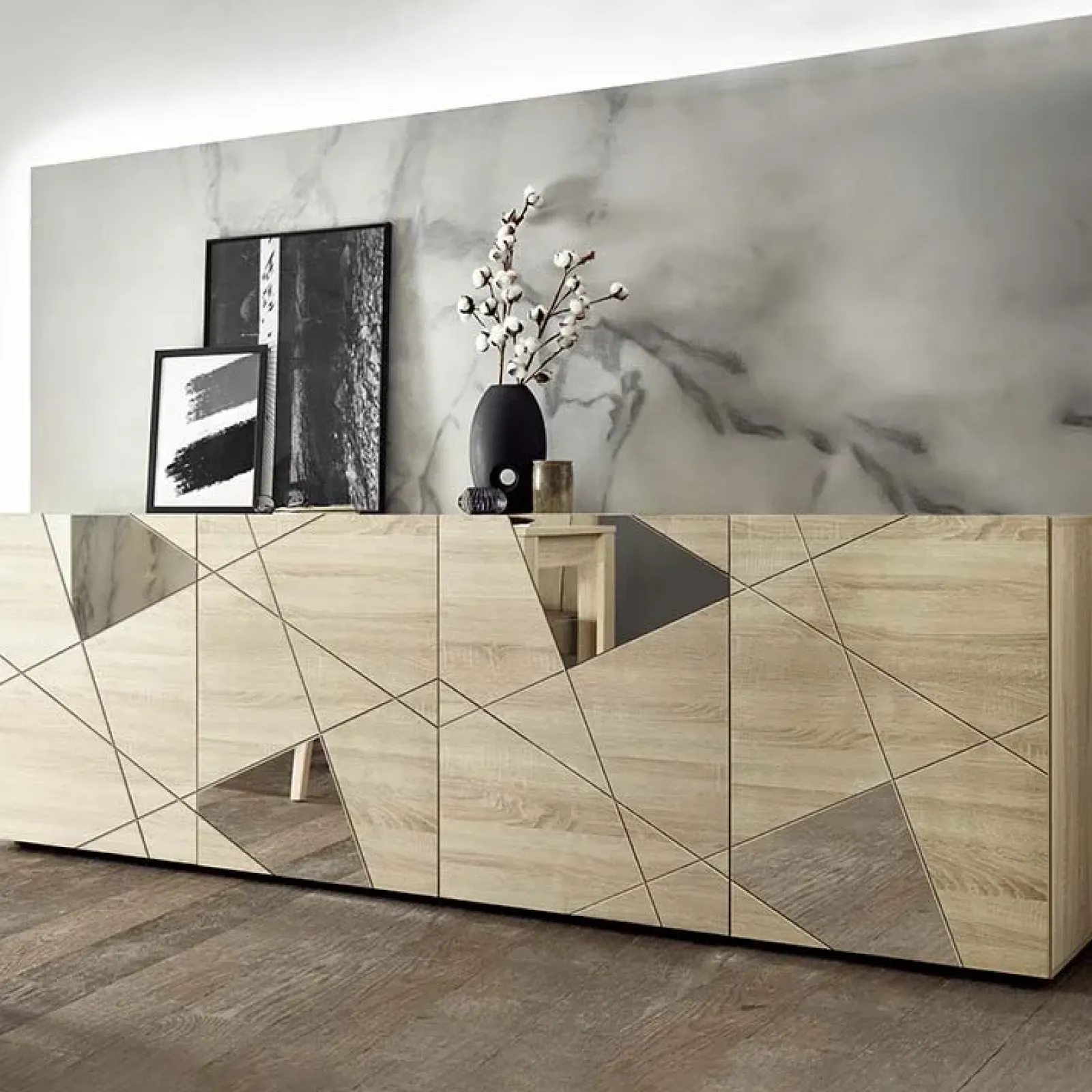 Garnero Arredamenti Credenze Moderne|Madie Moderne-Madia 241x84h cm 4 ante moderna samoa specchio con serigrafia Olimpo Rovere