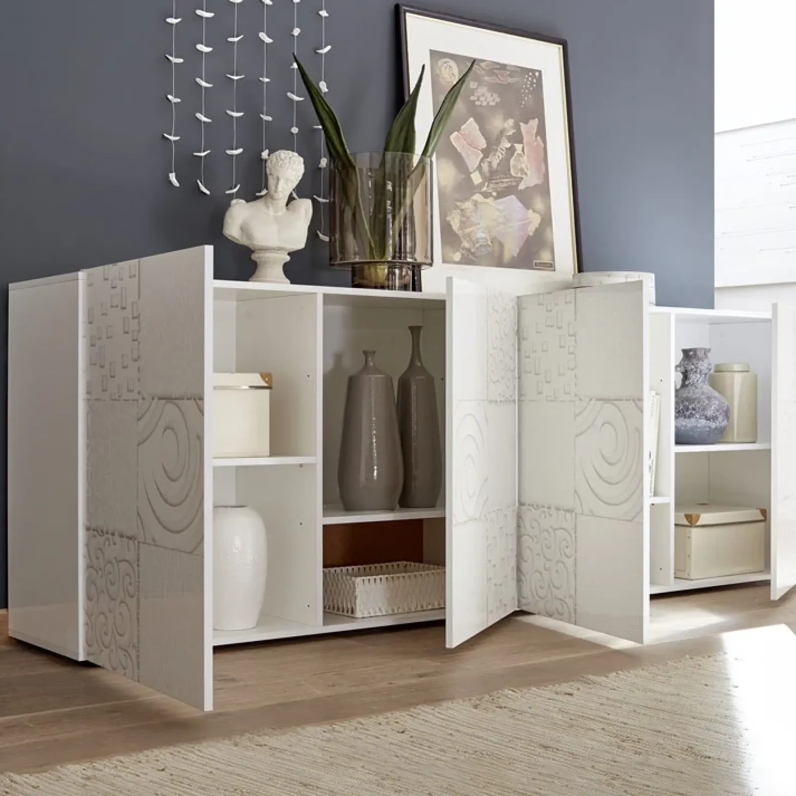 Realizzata nell’elegante finitura bianca con frontali serigrafati, Paradise diventerà la protagonista della sala! Si tratta di un mobile molto capiente, dotato di quattro ante battenti e quattro ripiani interni, per un’organizzazione razionale dello spazio. La Madia moderna 4 ante Paradise rappresenta sicuramente il complemento d’arredo irrinunciabile per chi vuole stupire con una scelta unica e ricercata.