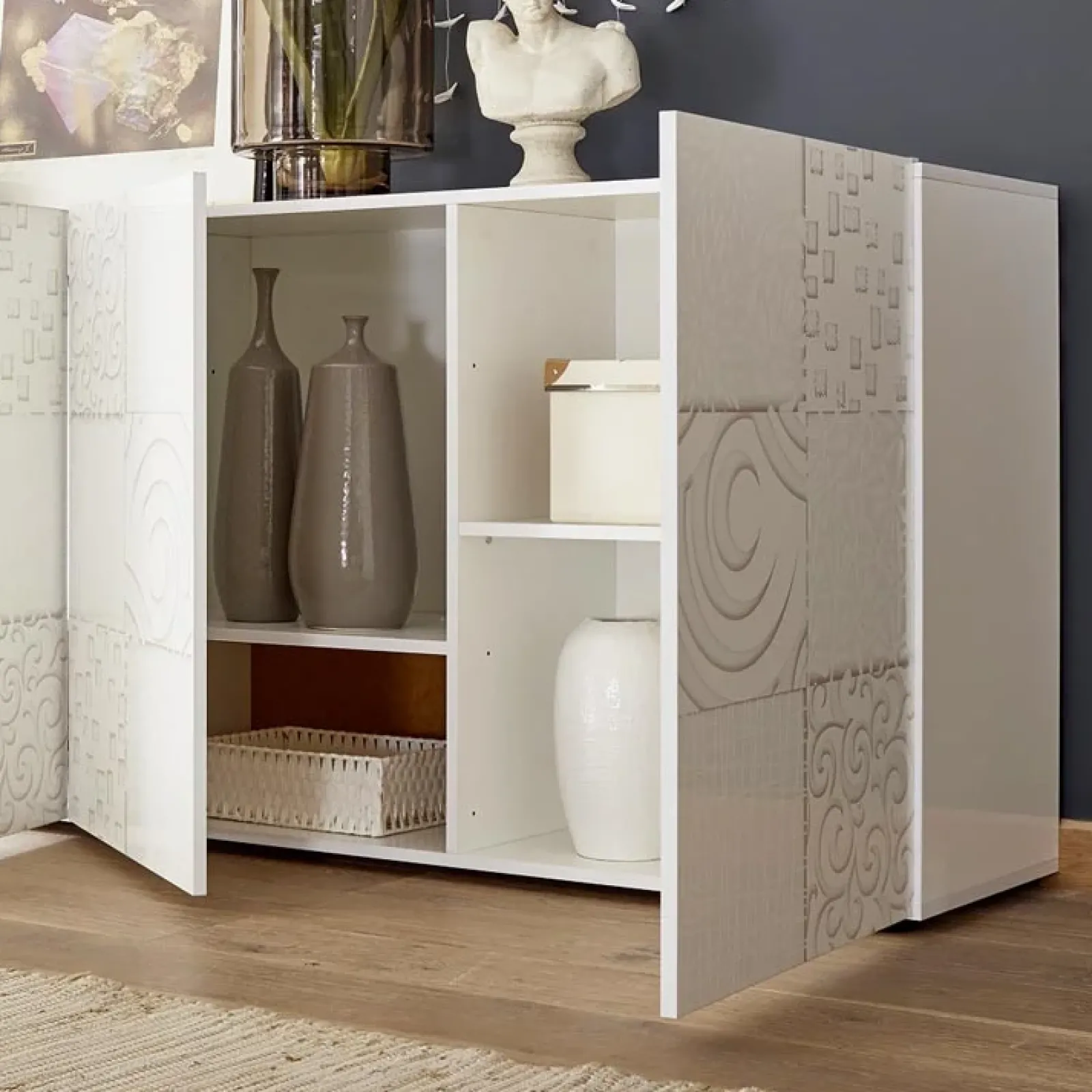 La madia moderna 4 ante Paradise è un complemento d’arredo estremamente versatile. Può essere protagonista del living, del corridoio o della zona ingresso in diversi modi: posizionandola lontano da altri elementi d’arredo già esistenti e poggiandovi su un vaso con una pianta particolarmente vistosa, si creerà un angolo davvero speciale!