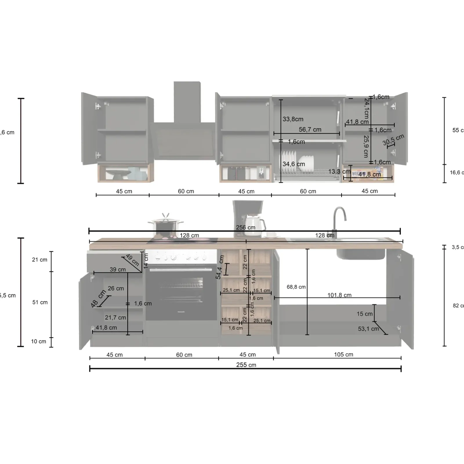 La parte superiore della cucina Gourmet è altrettanto funzionale e ben organizzata. Trovi tre moduli con ante battenti, ciascuno dei quali nasconde due vani, ideali per riporre stoviglie, bicchieri o alimenti. Il modulo dedicato allo scolapiatti si distingue per la sua elegante anta con vetrina, perfetta per esporre piatti e bicchieri con stile, aggiungendo un tocco sofisticato alla zona lavaggio.