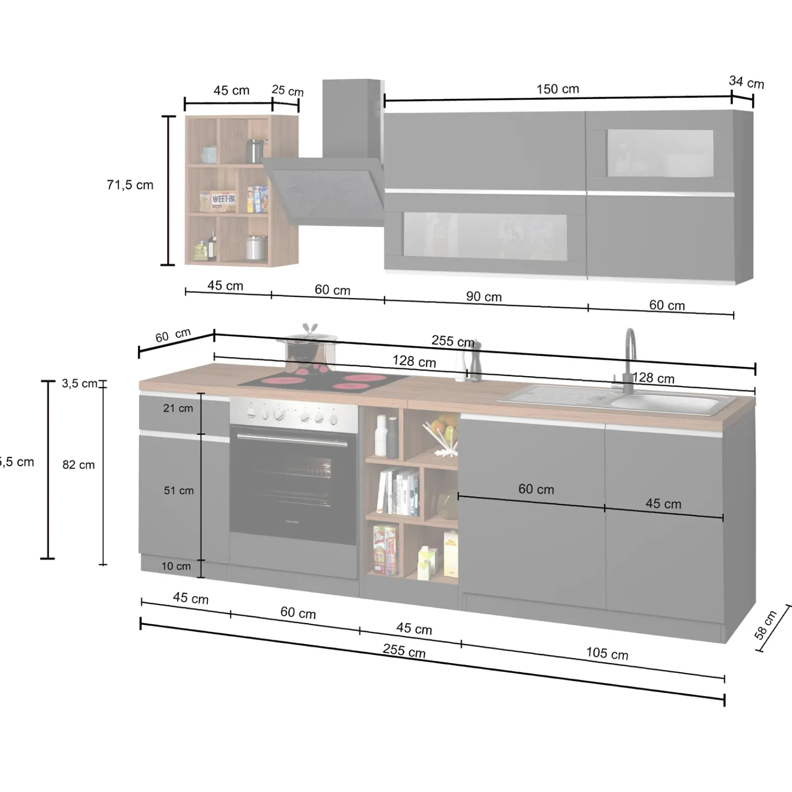 Nella parte superiore, la cucina Gourmet offre ancora più possibilità di personalizzazione. Un modulo con ripiani a vista aggiunge stile e funzionalità, perfetto per decorare con spezie, piante o elementi di design. Questo dettaglio porta coerenza visiva con la parte inferiore e permette di mantenere un’atmosfera aperta e ariosa.