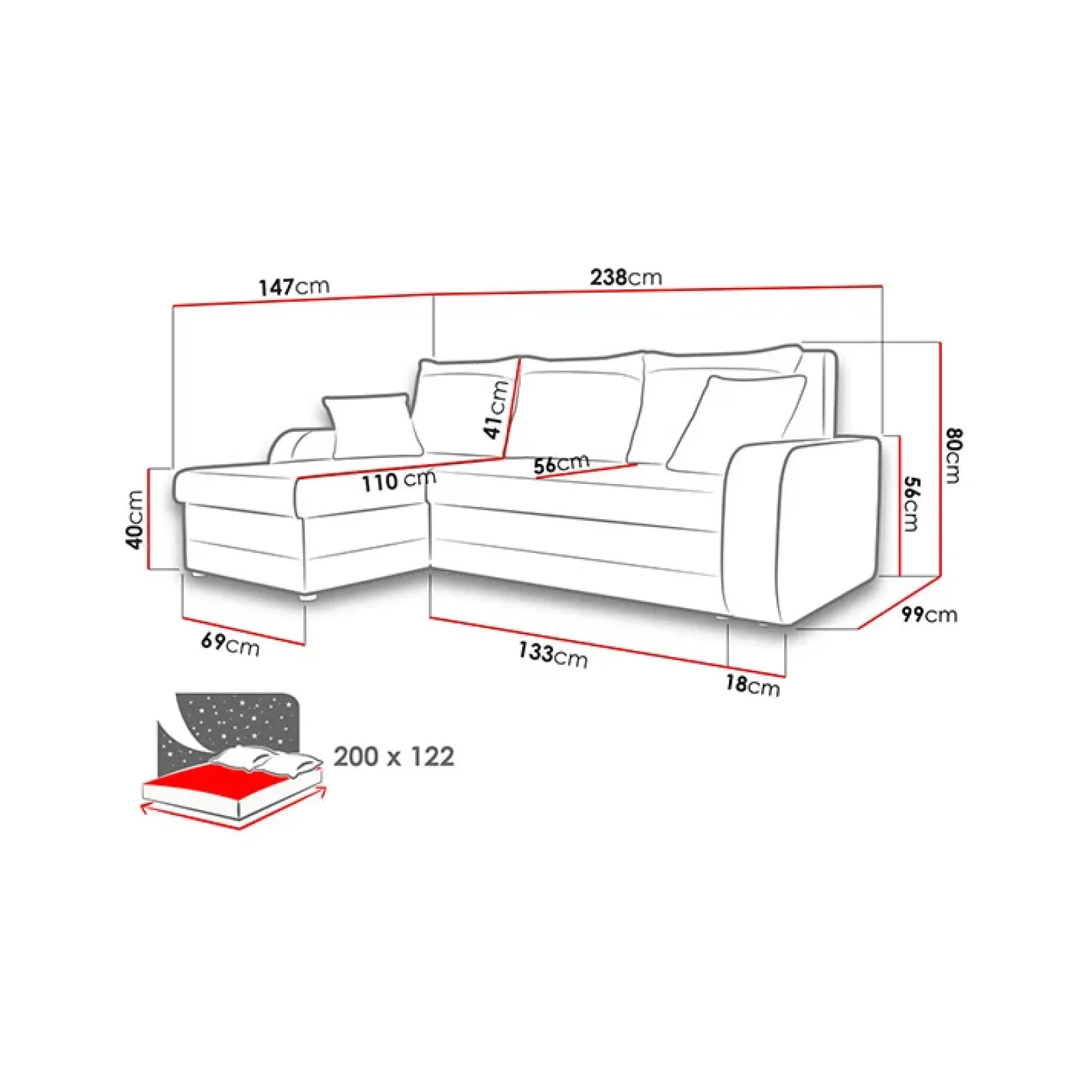 - dimensioni totali: L.238 x H.80 x P.147 cm