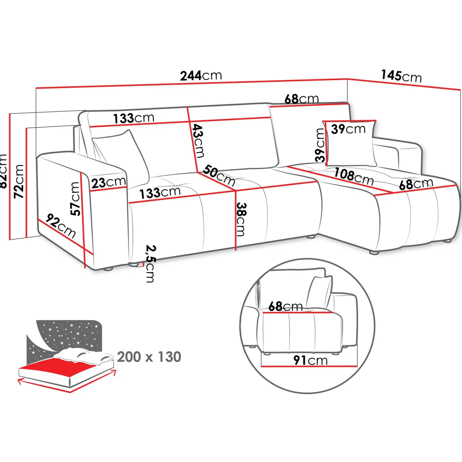 Il divano è dotato di angolo reversibile, per adattarsi perfettamente alla configurazione del tuo soggiorno, sia a destra che a sinistra. Completano il tutto due cuscini coordinati inclusi, per un tocco di comfort e armonia in più. Con il divano letto angolare 3 posti Orama, funzionalità e stile si incontrano per arredare con intelligenza e gusto.