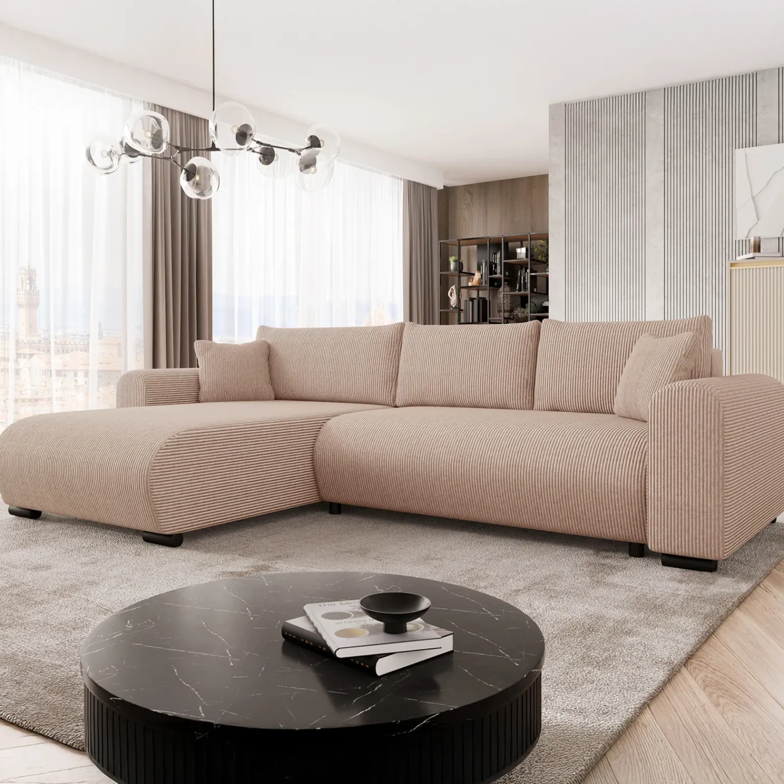 Divano letto angolare 4 posti 285x188cm con contenitore tessuto velluto a coste rosa Soft