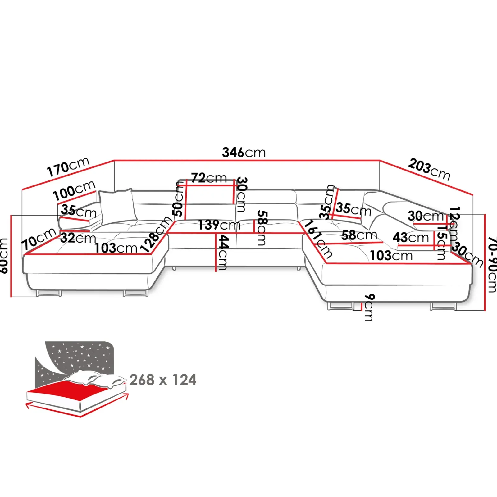 | Dimensioni | L.346 x H.70-90 x P.203 cm |