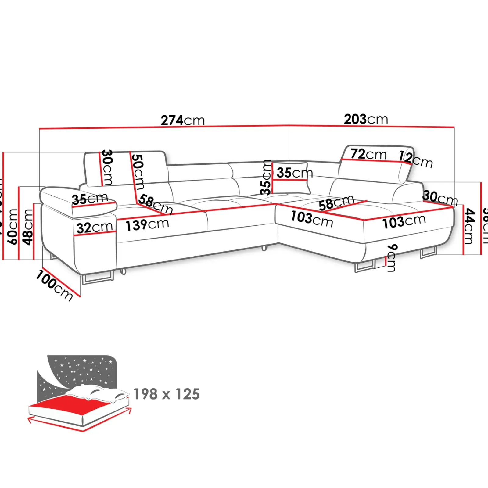 | Dimensioni | L.274 x H.70/90 x P.203 cm |