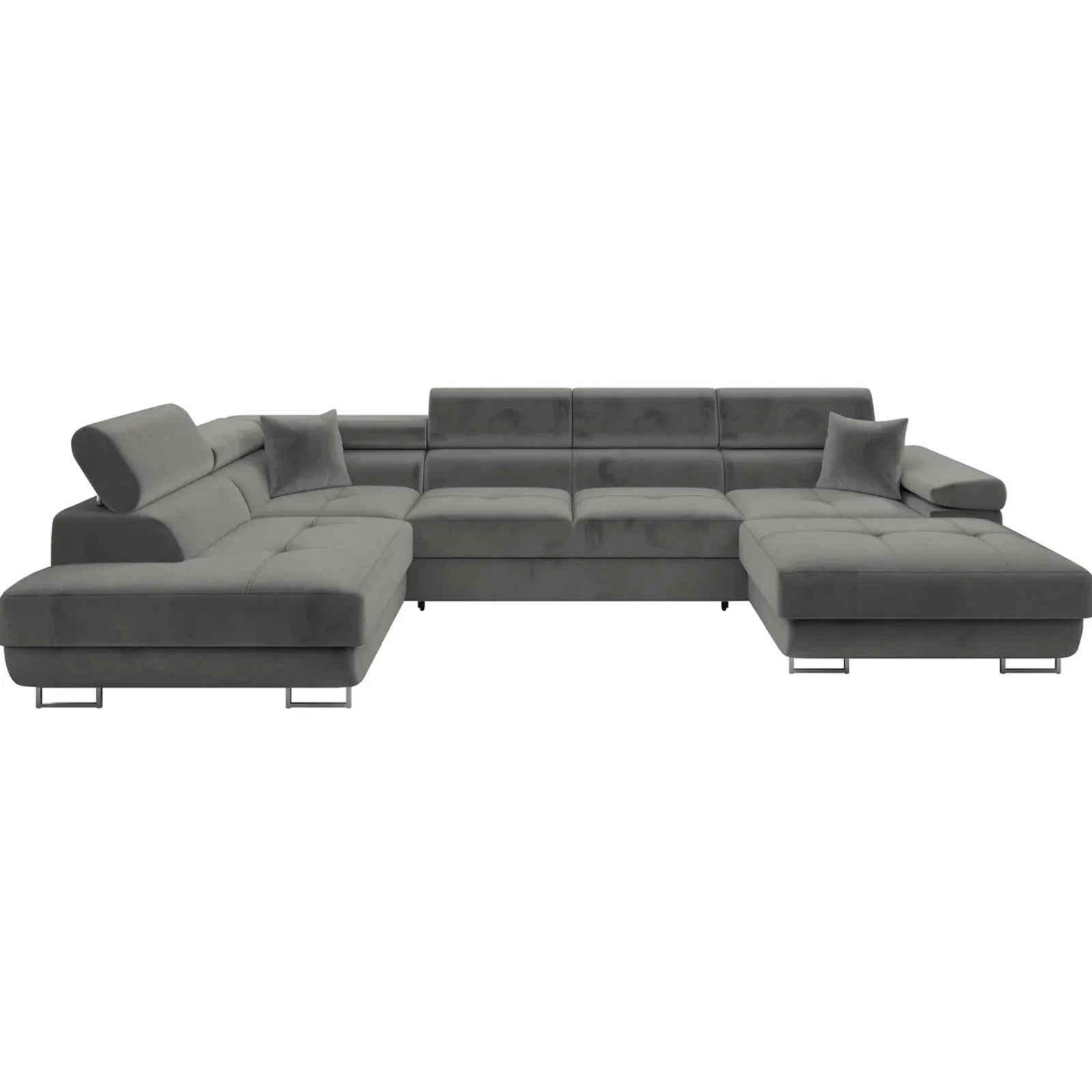 Il divano letto angolare Moirea a 5 posti è la scelta ideale per chi desidera un arredo pratico, elegante e dal design moderno. Rivestito in morbido velluto grigio, aggiunge un tocco di raffinatezza a qualsiasi ambiente, adattandosi con facilità sia a contesti contemporanei che più accoglienti. Grazie ai poggiatesta regolabili, Moirea garantisce un comfort superiore, permettendo di trovare la posizione perfetta per il relax. Il pratico meccanismo sotto la seduta consente di trasformare facilmente il divano in un comodo letto, ideale per ospiti o per concedersi un momento di riposo extra. L’estensione del letto, in elegante colore nero, si integra con discrezione nel design complessivo.
