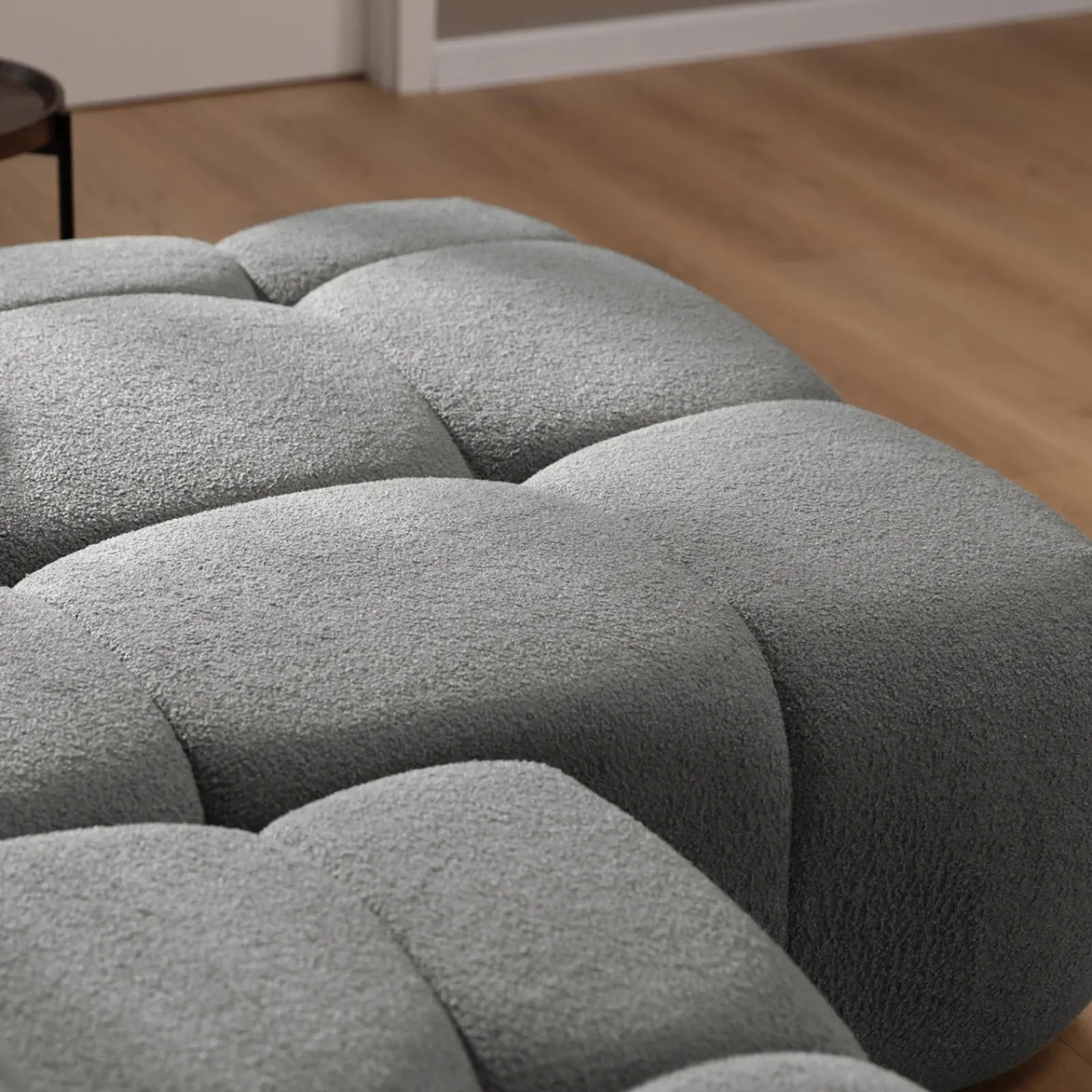 Rivestito in pregiato tessuto bouclé grigio scuro, Litos dona un tocco di eleganza raffinata al living, combinando morbidezza al tatto e resistenza all’uso quotidiano. La texture materica del bouclé esalta la profondità del colore, rendendo questo divano protagonista assoluto dello spazio.