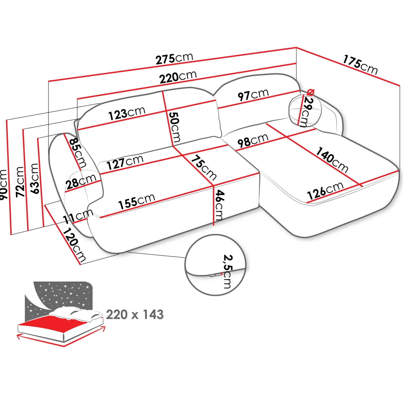 | Dimensioni superficie letto | 220×143 cm |