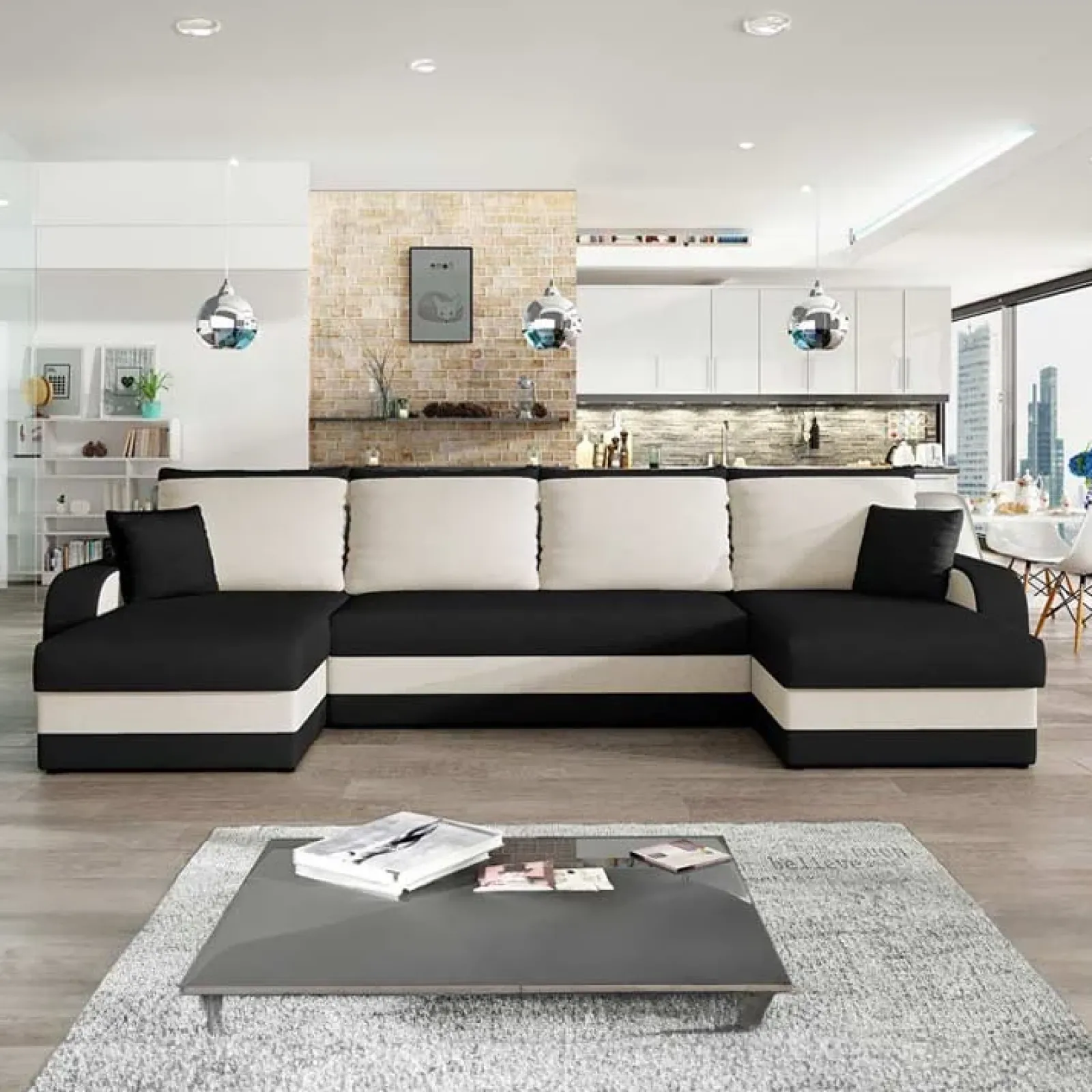 Divano letto 4 posti contenitore 304cm nero écru Assunta, spazioso e confortevole per un relax assicurato.
