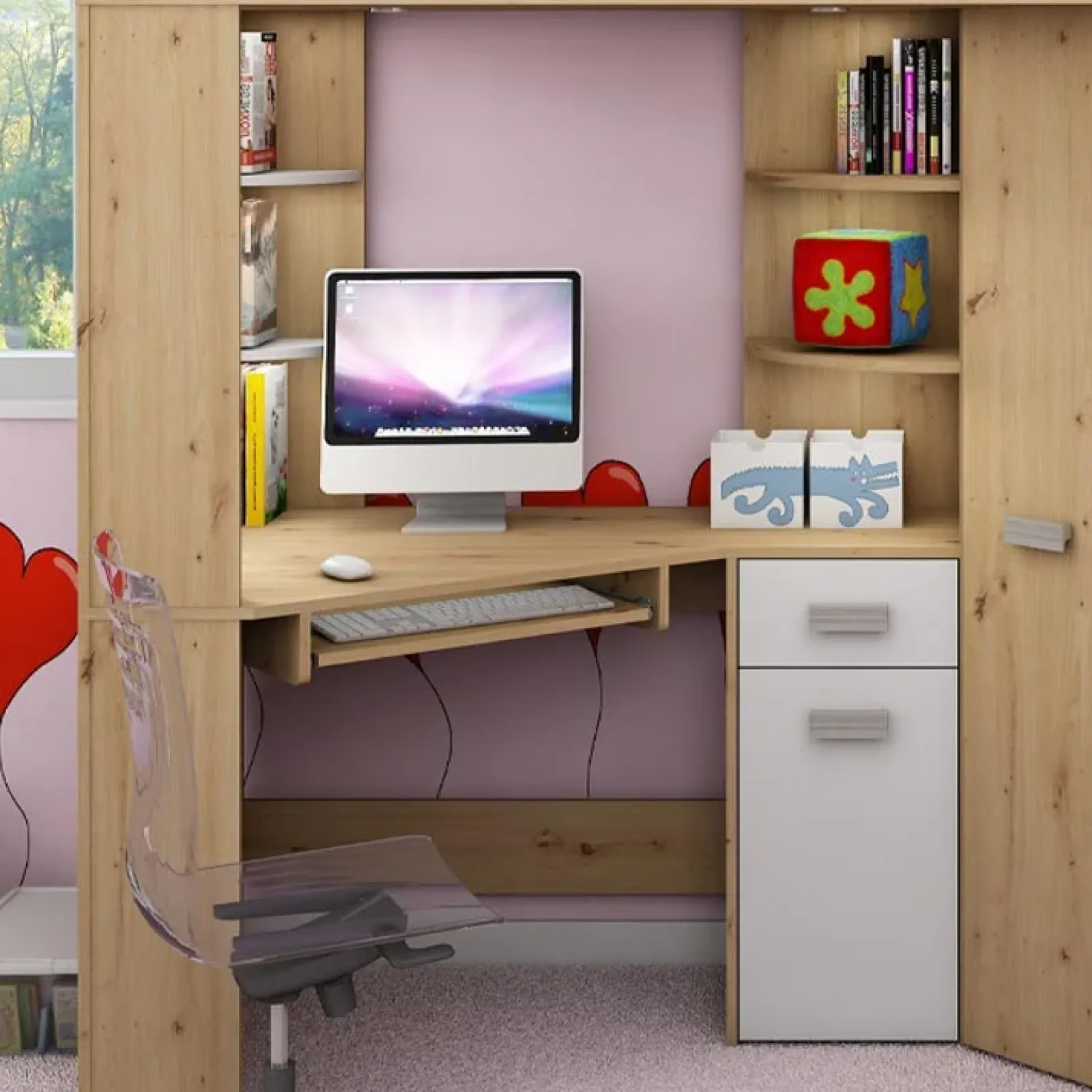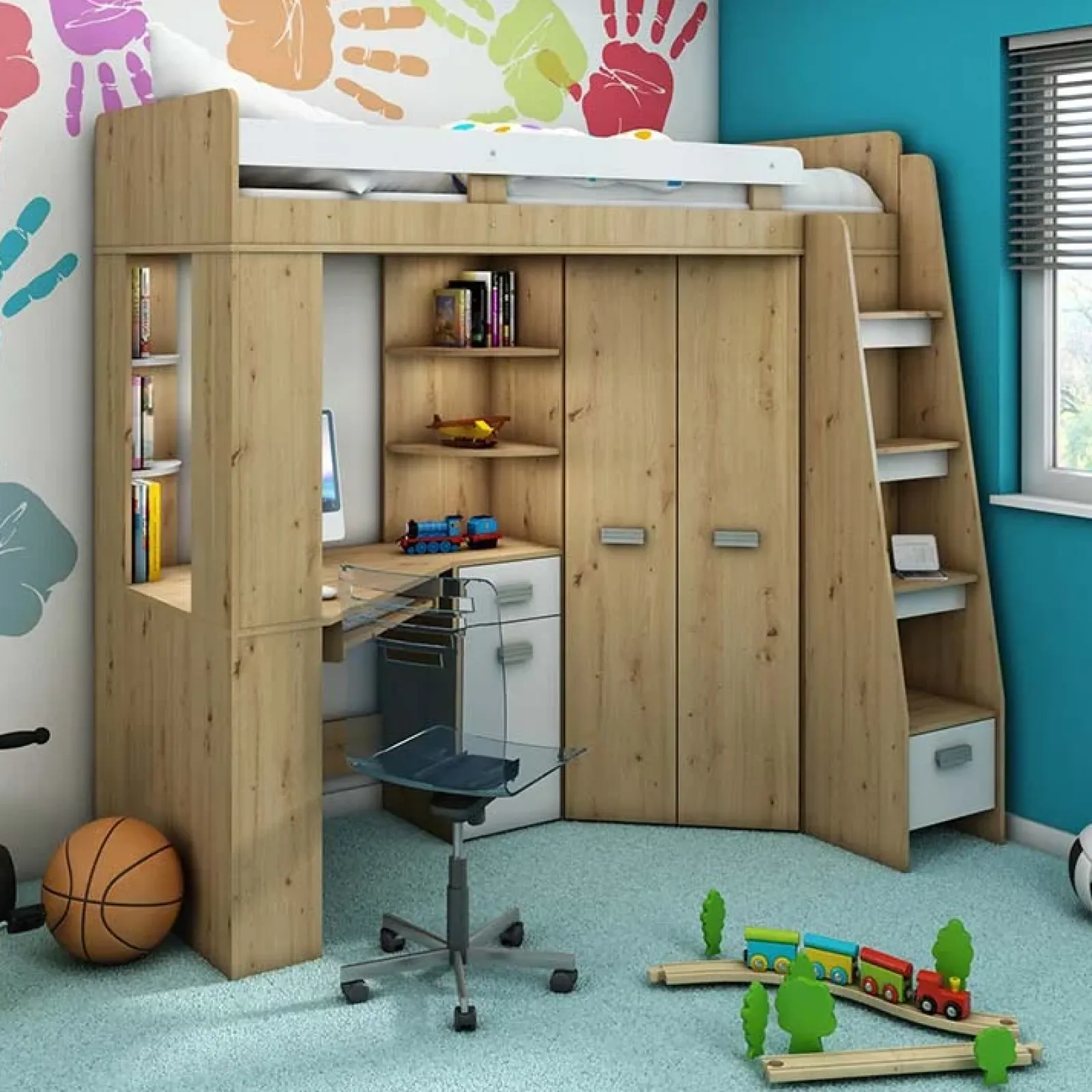 Offre un letto a castello raggiungibile da una scaletta con cassettone al fondo per contenere tutti i giocattoli. La parte inferiore, grazie alla sua pratica configurazione, può essere utilizzata come angolo studio e compiti. Inoltre dispone di un armadio a due ante per riporre indumenti vari, ripiano salvaspazio per la tastiera del tuo pc, mensole e cassetti per oggetti di cancelleria e libri. Funzionale ed elegante grazie alle linee semplici e finiture tenui, il letto a soppalco Dollie conquisterà i tuoi bambini e ragazzi che non avranno più scuse per mantenere in ordine la loro cameretta!