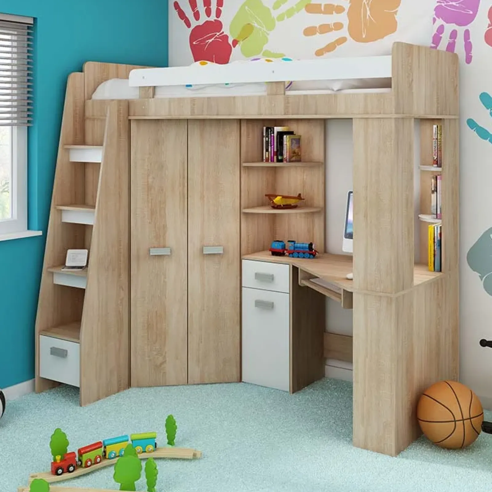 Scegli il letto a soppalco Dollie Gihome®! Risponde a tutte le tue esigenze! Offre un letto a soppalco raggiungibile da una scaletta con cassettone al fondo per contenere tutti i giocattoli. La parte inferiore, grazie alla sua pratica configurazione, può essere utilizzata come angolo studio e compiti. Inoltre dispone di un armadio a due ante per riporre indumenti vari, ripiano salvaspazio per la tastiera del tuo pc, mensole e cassetti per oggetti di cancelleria e libri. Funzionale ed elegante grazie alle linee semplici e finiture tenui, il letto a soppalco conquisterà i tuoi bambini e ragazzi che non avranno più scuse per mantenere in ordine la loro cameretta!