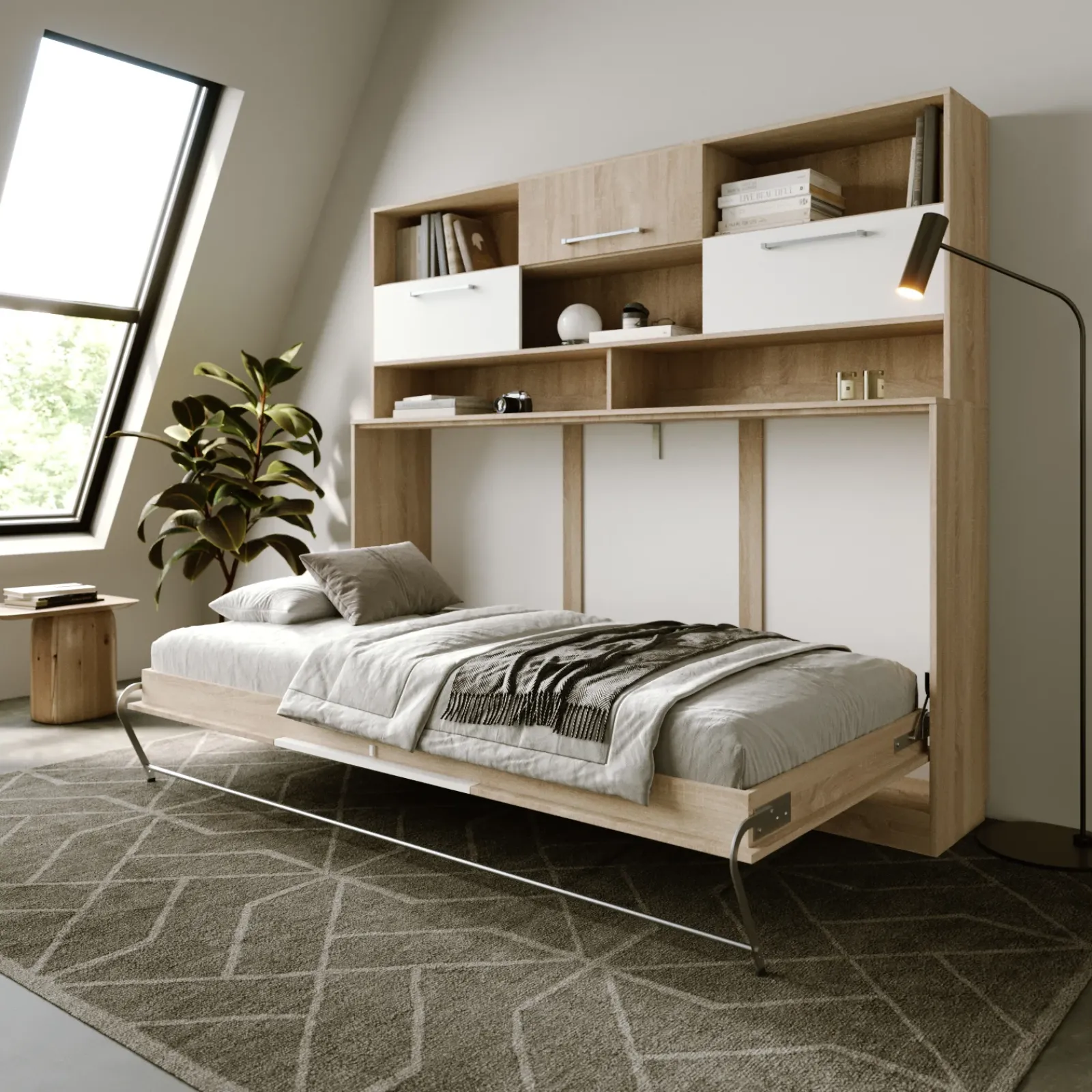 Garnero Arredamenti Letti A Scomparsa|Letti Singoli-Letto a scomparsa orizzontale 90x200cm singolo con libreria rovere bianco Alvin Gihome® Rovere – Bianco opaco