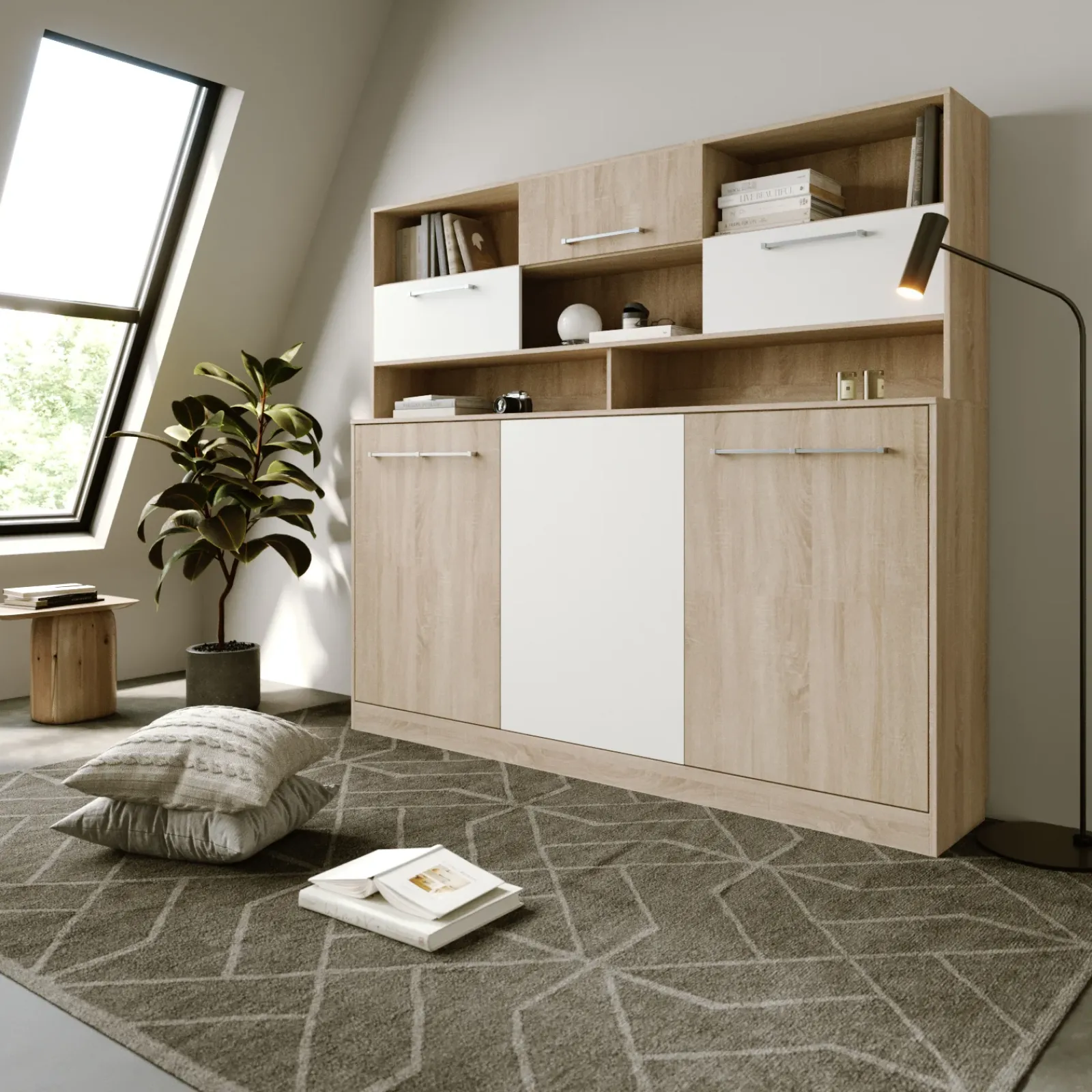 Con il suo design moderno in finitura rovere e inserto a contrasto bianco, si integra perfettamente in ogni ambiente. Linee essenziali, massima funzionalità: grazie alle due pratiche maniglie, in un solo gesto Alvin si apre trasformandosi in un comodo angolo di riposo.