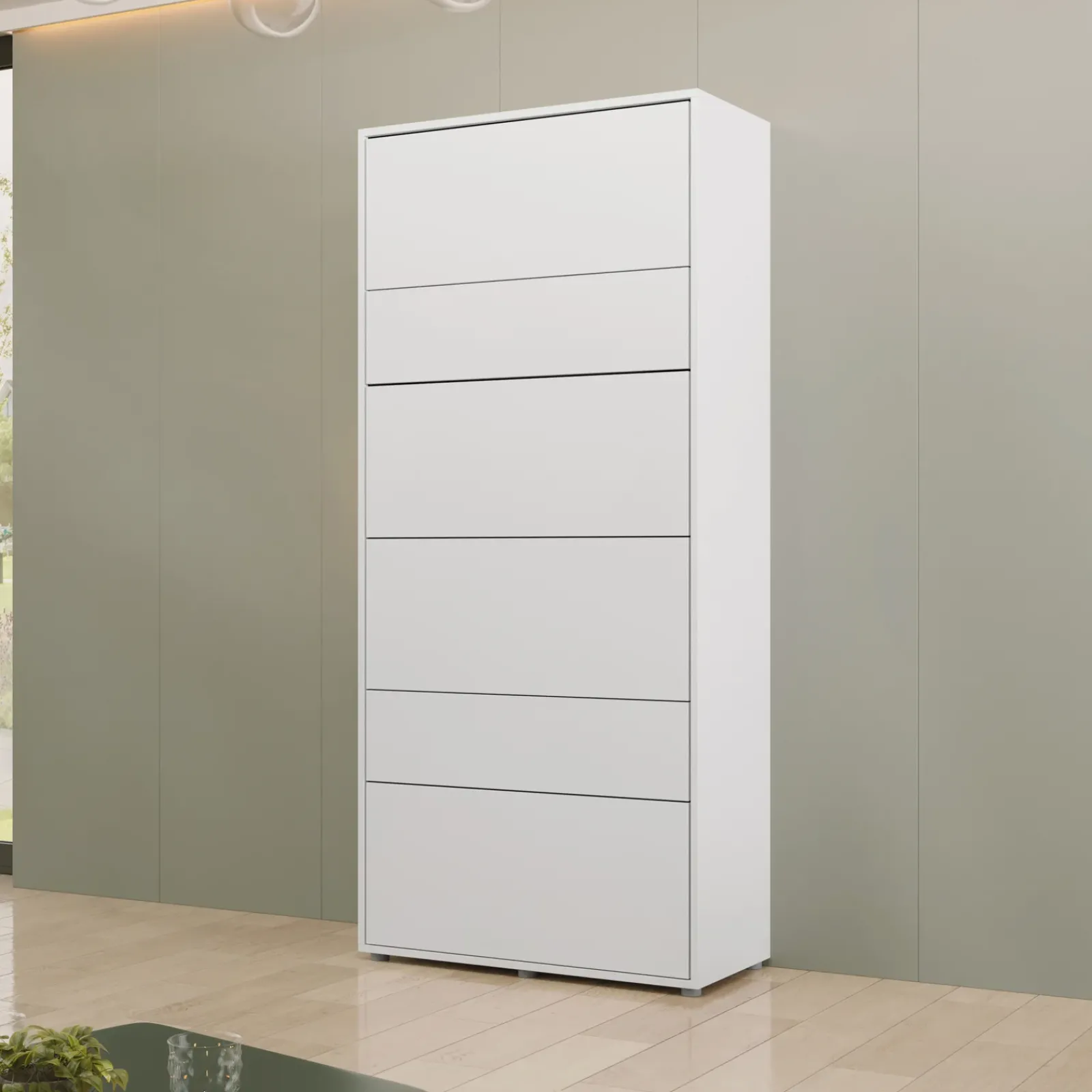 Camelio è il letto a scomparsa verticale pensato per chi desidera ottimizzare ogni centimetro senza rinunciare a stile e funzionalità. Con un design essenziale in bianco opaco, si adatta con discrezione e raffinatezza a qualsiasi ambiente: dalla zona giorno alla cameretta. Progettato per accogliere un materasso singolo da 90x200 cm, è dotato di una rete a doghe inclusa, ideale per offrire comfort e traspirabilità durante il riposo. L’apertura è semplice e intuitiva: basta premere lo sportello frontale, grazie al sistema push-to-open integrato e privo di maniglie a vista, per mantenere un’estetica pulita e moderna. Una volta sbloccato, il letto si abbassa lentamente con un movimento controllato, garantendo un utilizzo fluido e sicuro.