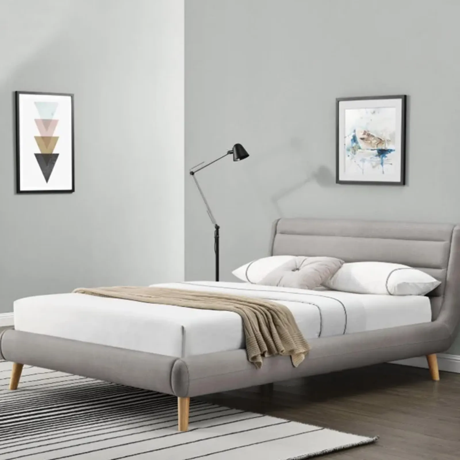 Proposto in versione alla francese, Pompei Gihome ® presenta testiera e giroletto in tessuto grigio chiaro e piedini in legno naturale.